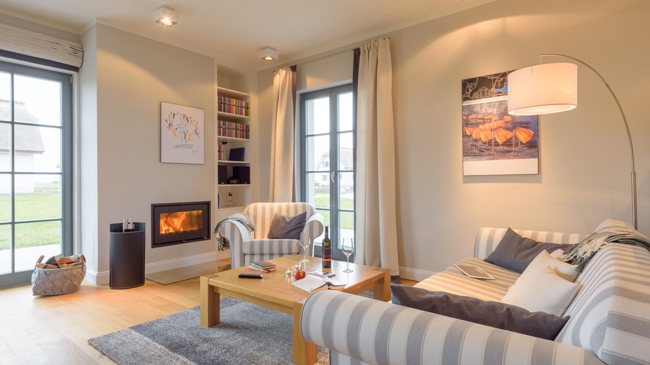 Das Reetdachhaus (ca. 116m²) bis 4 Personen (plus Kleinkind bis 3 Jahre) bietet 2 Schlafzimmer. Im Erdgeschoss erwartet Sie ein großer Wohn-Essbereich mit Küchenzeile und Kamin. Die eigene Sauna, ein Gäste-WC und ein Hauswirtschaftsraum vervollständigen das Raumangebot im EG. Im Dachgeschoss befindet sich ein großes Schlafzimmer mit Sitzgruppe. Das große Bad mit Wanne und Dusche lädt zum Entspannen ein. Ein weiteres Schlafzimmer befinden sich ebenfalls hier. Im Erdgeschoss lädt die 15m² große Terrasse mit großer Liegewiese zum Entspannen ein.