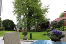 Die Ferienwohnung verfügt über eine voll ausgestattete Küche, 1 Esszimmer mit Blick in den Garten, 1 Wohnzimmer mit einem schwedischen Kamin, 1 Mittelwohnraum mit einem Schlafsofa, 2 Schlafzimmer mit je einem Doppelbett, 1 Duschbad, 1 Wannen-/ Duschbad (barrierefrei), ein Hauswirtschaftsraum mit Waschmaschine und Wäschetrockner, sowie eine überdachte Terrasse mit Gartenmöbeln. Am Haus steht Ihnen eine Doppelgarage und ein Fahrradabstellraum zur Verfügung.