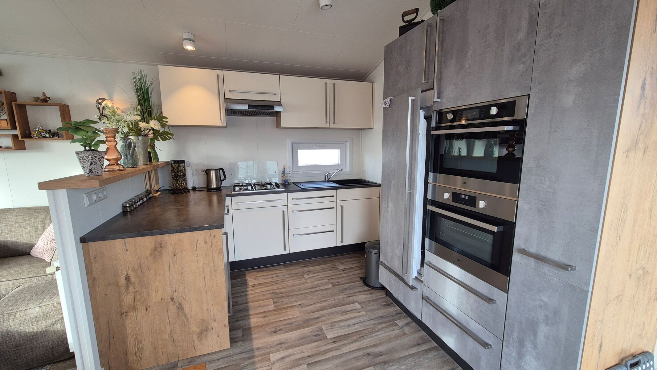 ☼ Küche mit 4-Wege-Gasherd, Spülmaschine, Mikrowelle, Backofen, Kühlschrank, Senseo-Kaffeemaschine, Toaster und Wasserkocher.