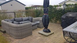 ☼ geräumige Terrasse mit Gartenmöbeln und schwenkbarem Sonnenschirm, Grill