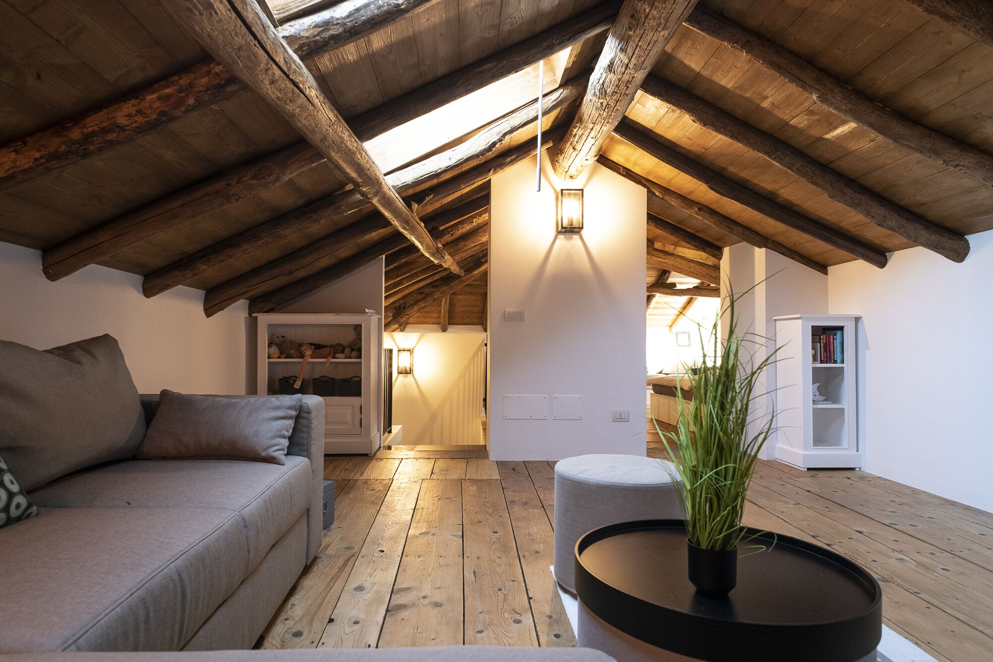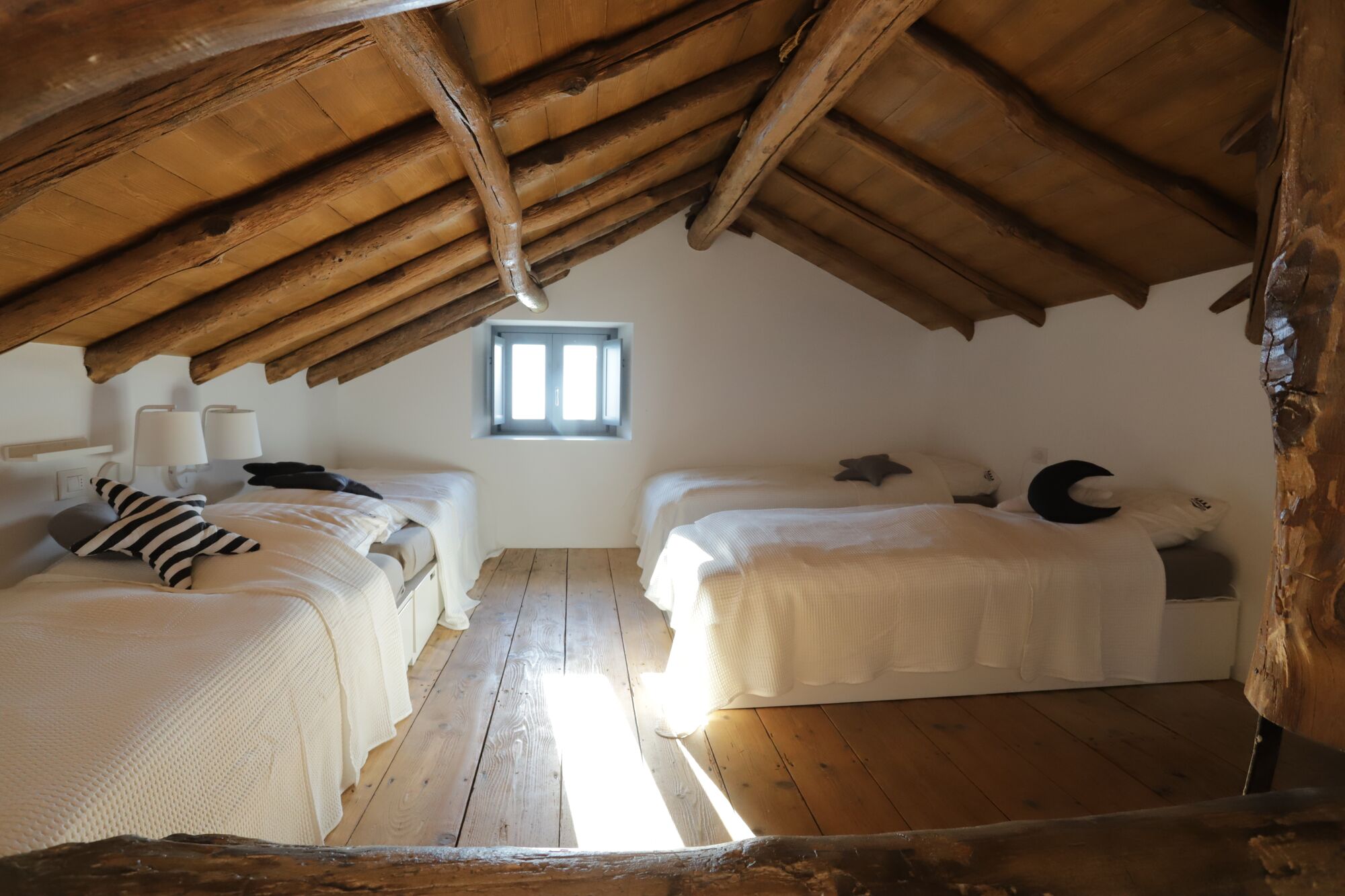 LUNA E STELLE - Im Dachgeschoss erwarten Sie liebevoll restaurierte Originalelemente wie Holzböden und Balken sowie kleine Fenster mit beeindruckender Aussicht. Ein Schlaf- und Spielbereich bietet Kindern einen idealen Ort zum Spielen und Entspannen. Es gibt vier vollwertige Einzelbetten sowie ein kleineres Bett für die jüngsten Gäste. Zusätzlich gibt es ein kleines Bad mit Toilette und Waschbecken für Kinder.