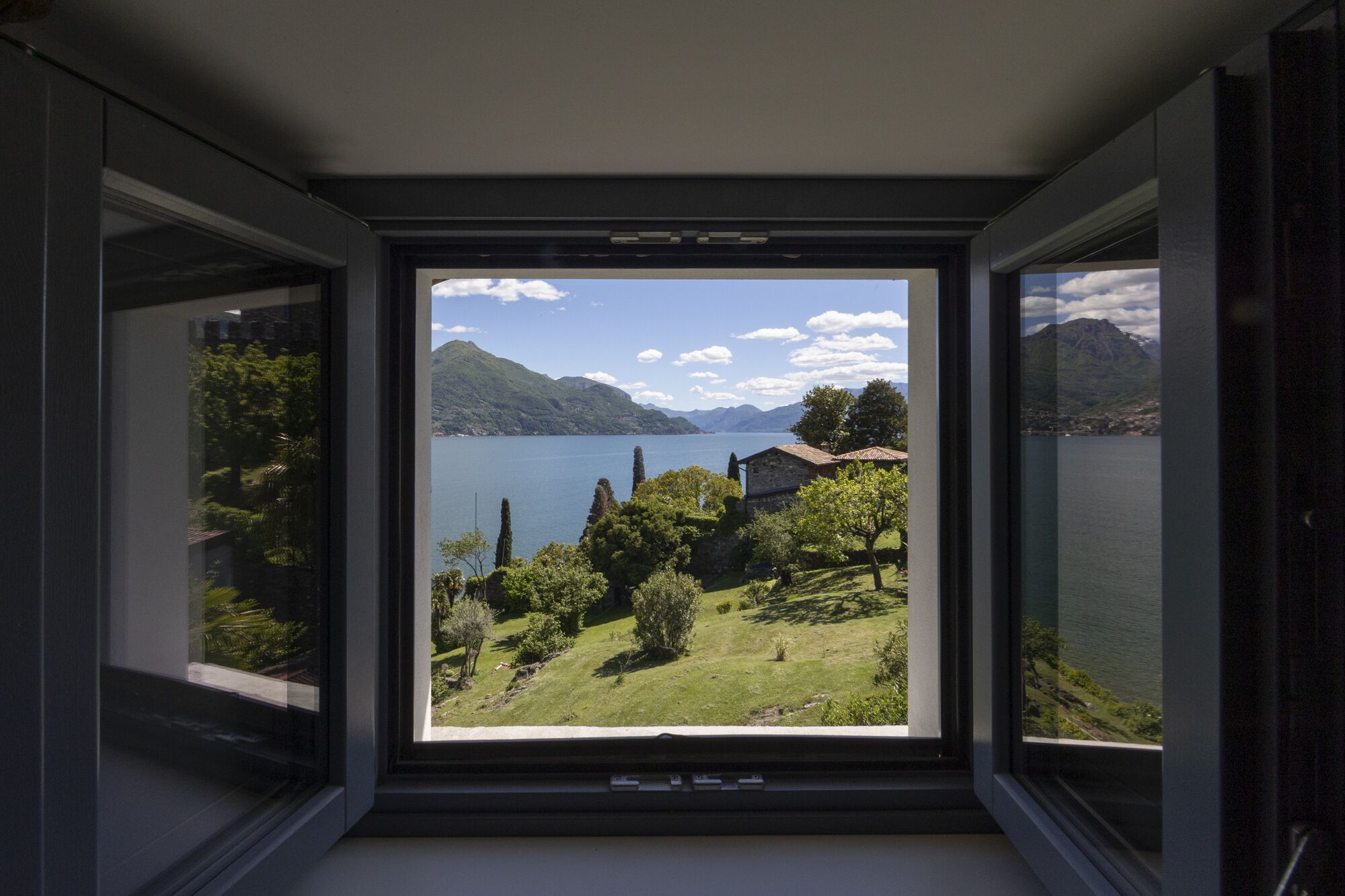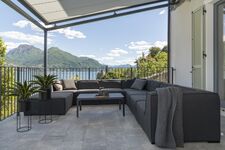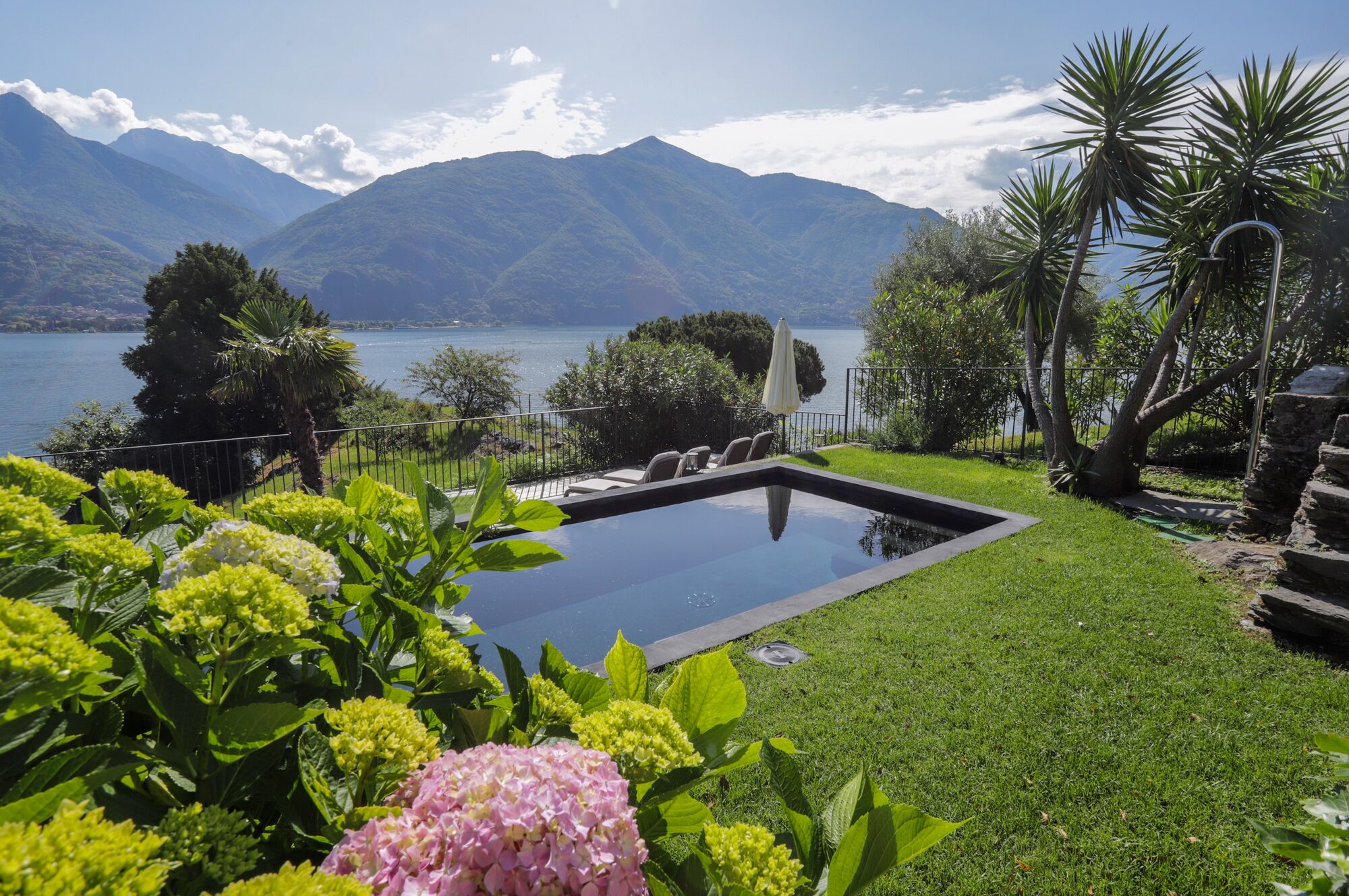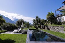 Der Garten bietet einen faszinierenden Blick auf Berge, Sonnenlicht und den Comer See. Ein kleiner Fußweg unterhalb der Terrasse wird nur von einem Nachbarn genutzt und sorgt für zusätzliche Ruhe. Sonnenliegen laden dazu ein, die Umgebung in völliger Gelassenheit zu genießen – ein Rückzugsort für jede Jahreszeit.