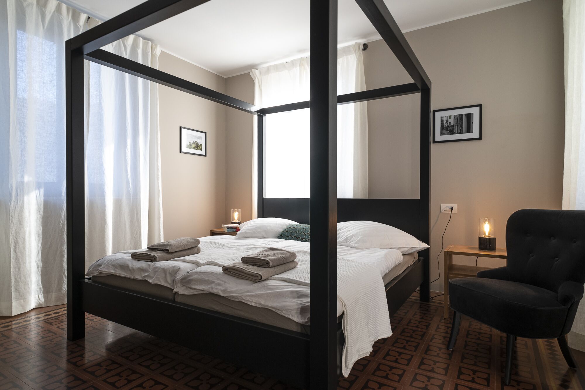 **DESIDERIO** – das zweite Schlafzimmer im zweiten Stock, sehr hell und luftig durch Fenster an drei Seiten, gilt als Master-Schlafzimmer mit Himmelbett und romantischer Atmosphäre. Das Bad verfügt über eine große Dusche und Seeblick.