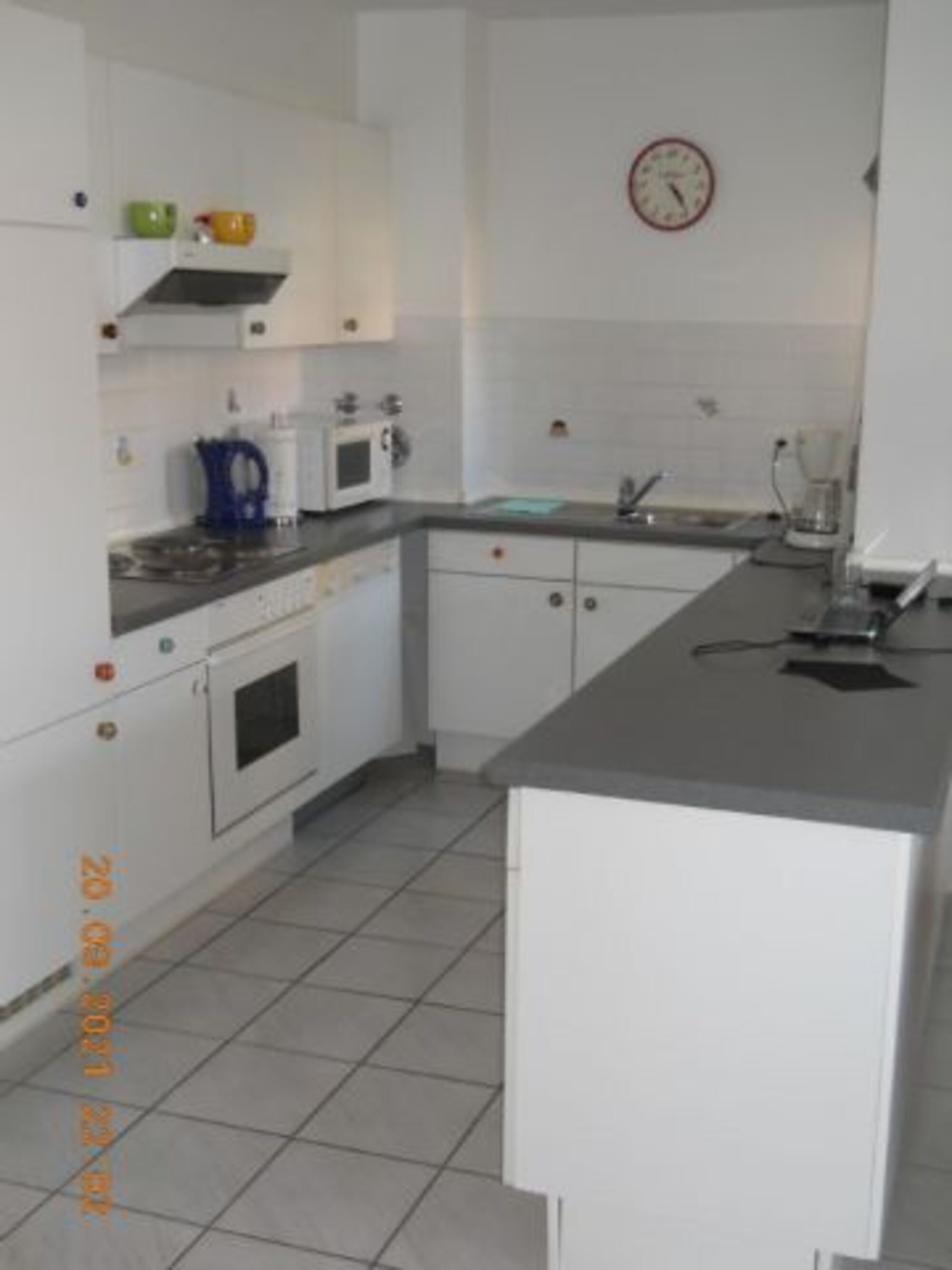 4-Platten Herd, Cerankochfeld, Kühlschrank mit Gefrierfach, Eierkocher, Mixer, Korkenzieher / Flaschenöffner, Geschirrhandtücher, Mülltüten, TV in der Küche