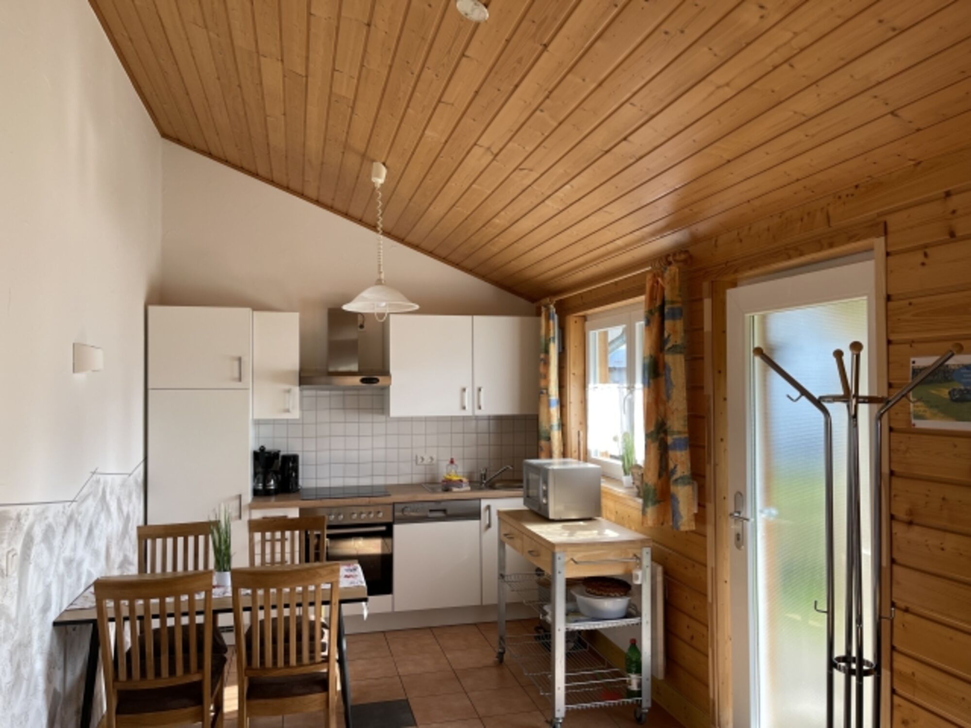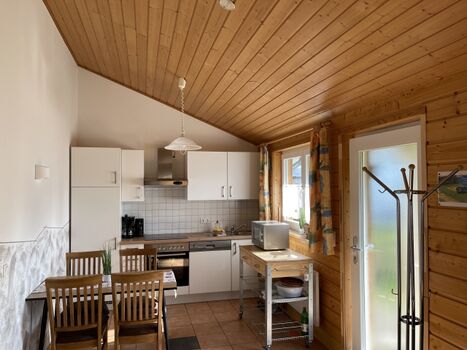 Cerankochfeld, Dunstabzugshaube, Gefrierschrank, Mixer, Korkenzieher / Flaschenöffner, Geschirrhandtücher, Mülltüten, Essplatz in der Küche