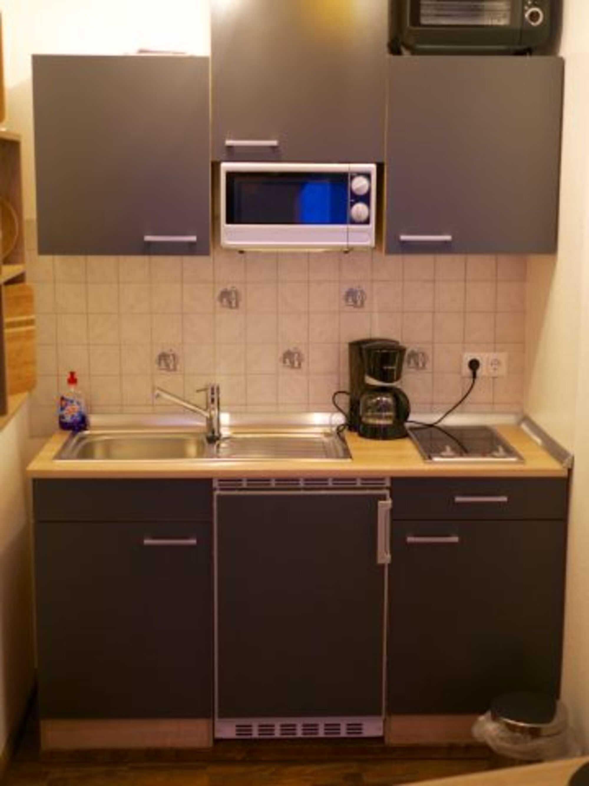 2-Platten Herd, Induktionsherd, Kühlschrank mit Gefrierfach, Kaffeevollautomat, Eierkocher, Korkenzieher / Flaschenöffner, Gewürze (Salz, Pfeffer, Zucker), Geschirrhandtücher, Mülltüten, Essplatz in der Küche, TV in der Küche