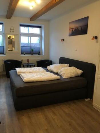 Wohnung LÜTT, ca. 30 m², bis zu 3 Personen. Modern, komplett neu und modern, direkt am "Alten Hafen" von Hooksiel, Bj. 1802, zentral, mit Blick aufs Wasser. Mittendrin statt nur dabei. ALLES NEU! Im Haus befinden sich noch eine 40 m², eine 75 m² Wohnung und eine 160qm Wohnung für 14 Personen