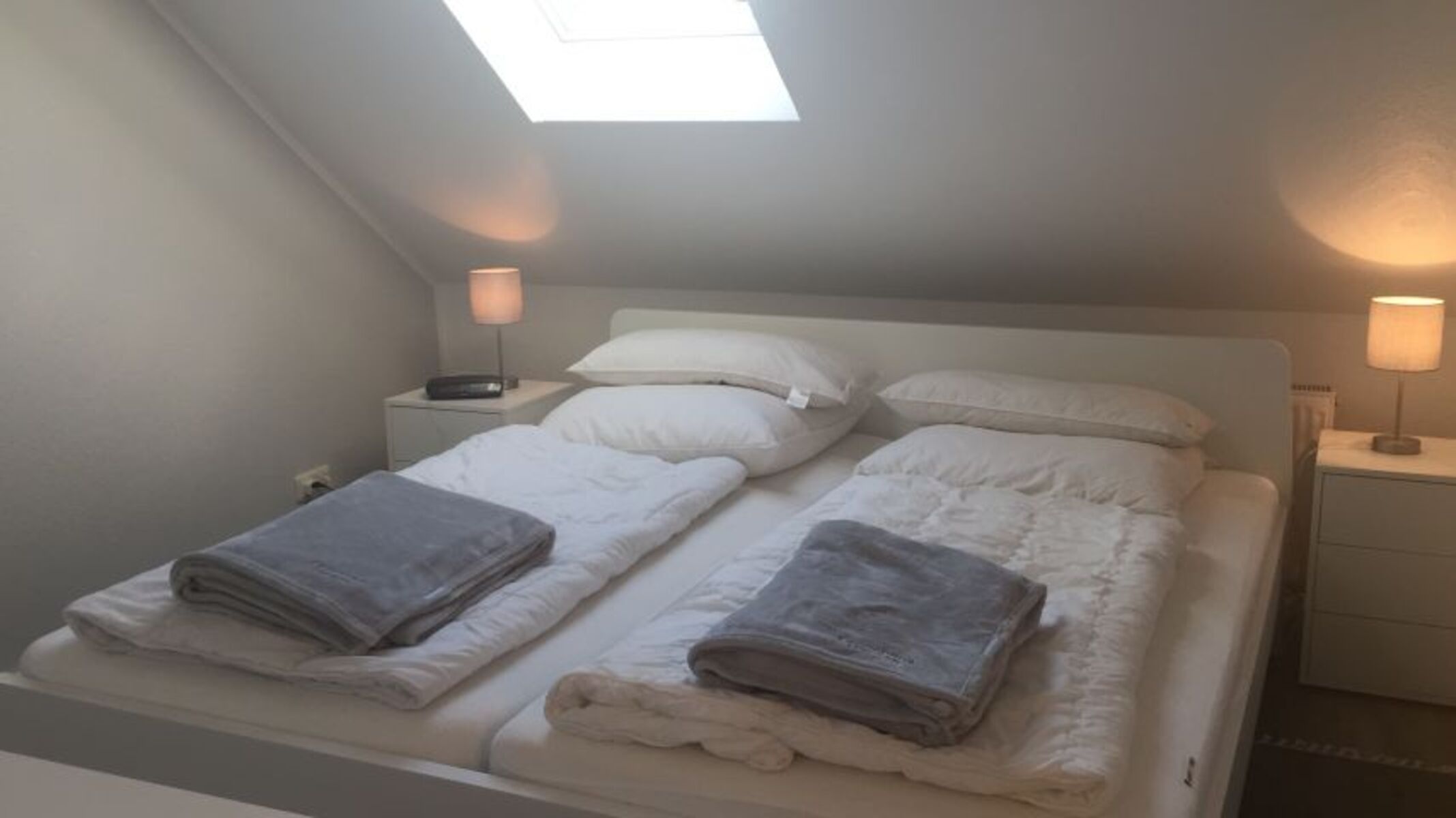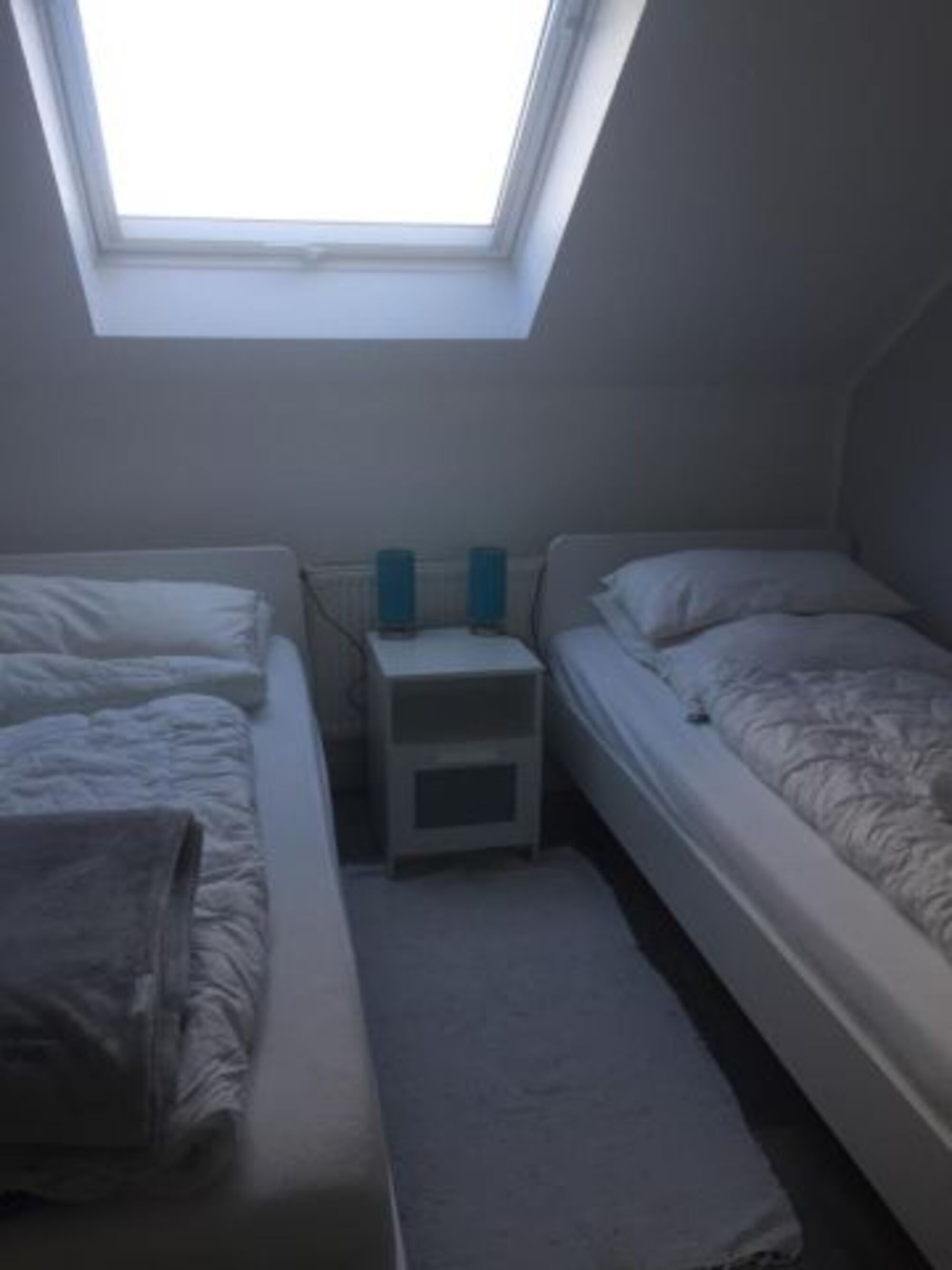 Im Obergeschoss ist das Duschbad mit WC, zwei Schlafzimmer, ein Schlafzimmer mit einem Doppelbett und ein Schlafzimmer mit zwei Einzelbetten.