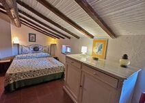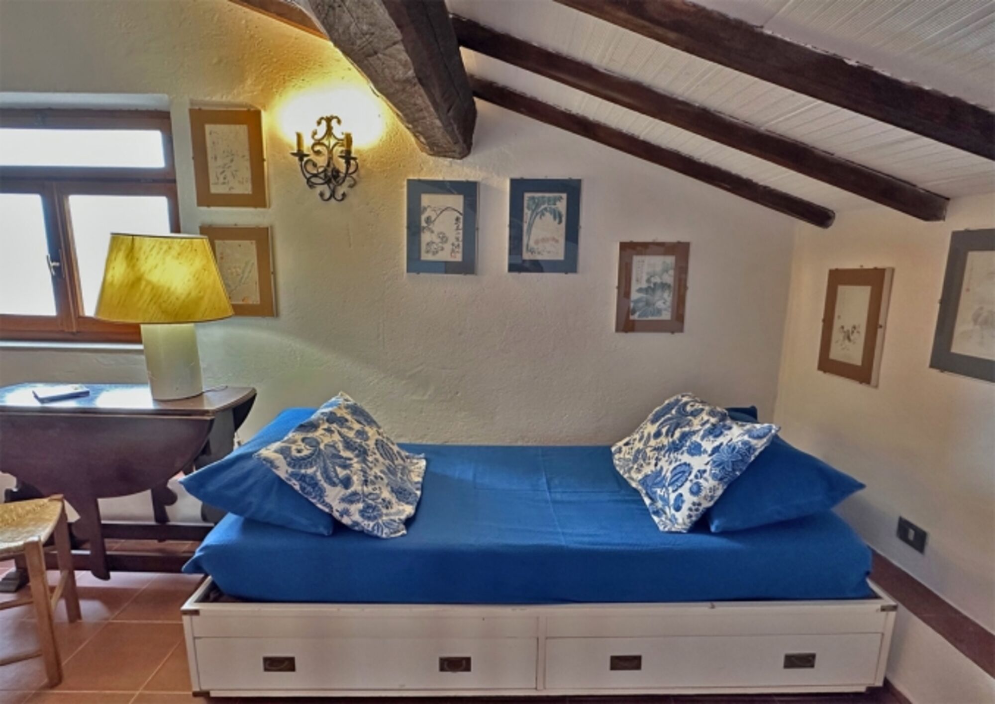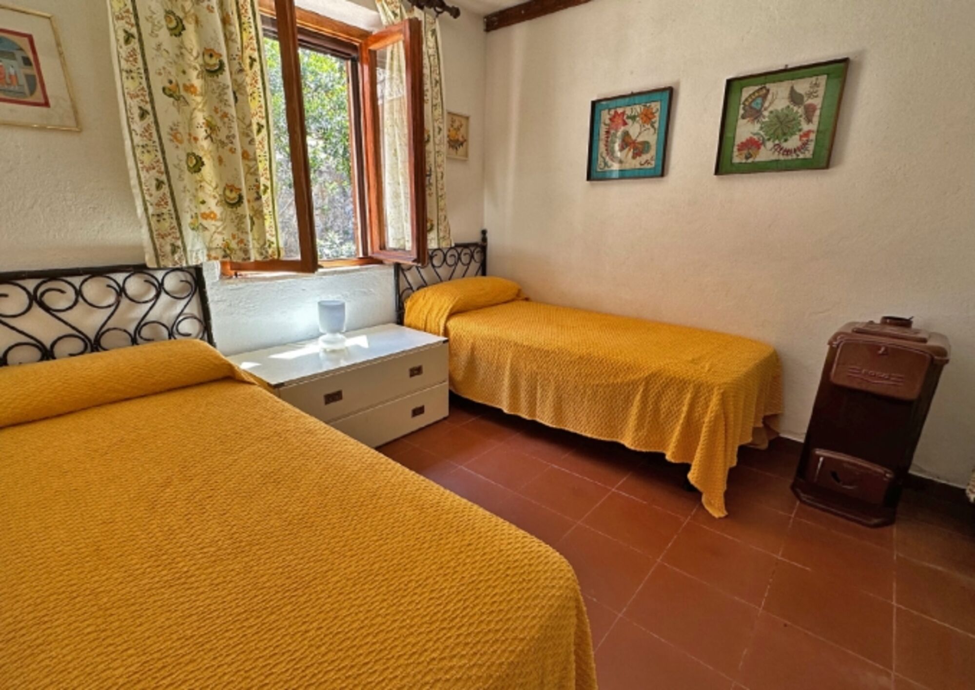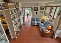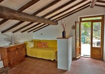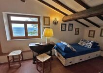 Im oberen Stock gibt es einen großen Raum mit zwei Schlafmöglichkeiten, ein weiteres Schlafzimmer mit Doppelbett und Einzelbett, sowie ein kleines Badezimmer mit Dusche. Der obere Bereich hat außer der Treppe vom Wohnzimmer im Erdgeschoss auch einen eigenen Ausgang zum hinteren höher gelegenem Garten und bietet somit die Möglichkeit die beiden Stockwerke auch getrennt zu bewohnen.