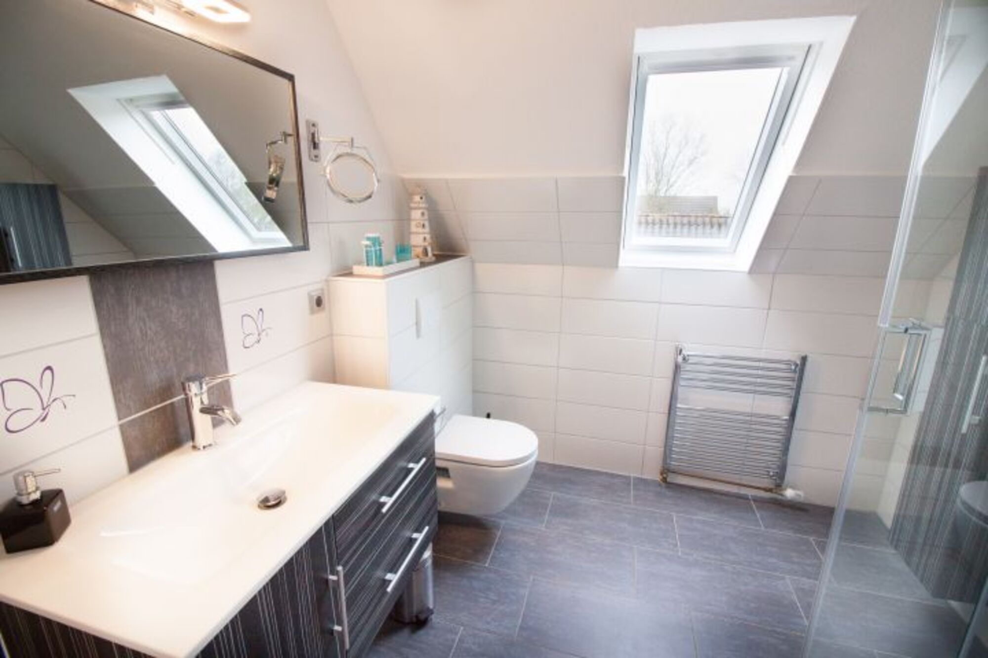 Waschbecken, Regendusche, Spiegel, Fenster im Bad