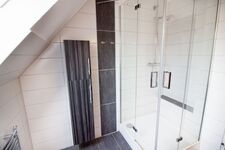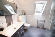 Auch wenn diese Wohnung im Obergeschoss liegt, bietet sie alles, was es braucht, um sich wie zuhause zu fühlen. Man hat seinen eigenen Eingang. Die Haustür führt direkt in den eigenen, umzäunten Garten. Man kann sie im Sommer getrost offen stehen lassen, damit z. B. Kinder und Hunde rein und raus können, wie sie möchten. Im Hauswirtschaftsraum, der von beiden Parteien genutzt wird, gibt es sowohl Waschmaschine wie auch Trockner.