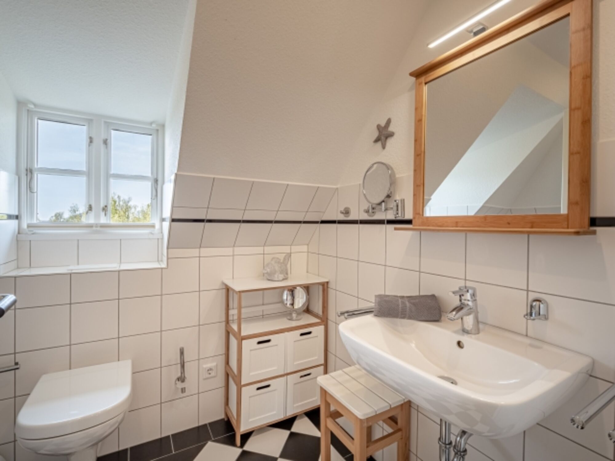 Waschbecken, Spiegel, Fenster im Bad