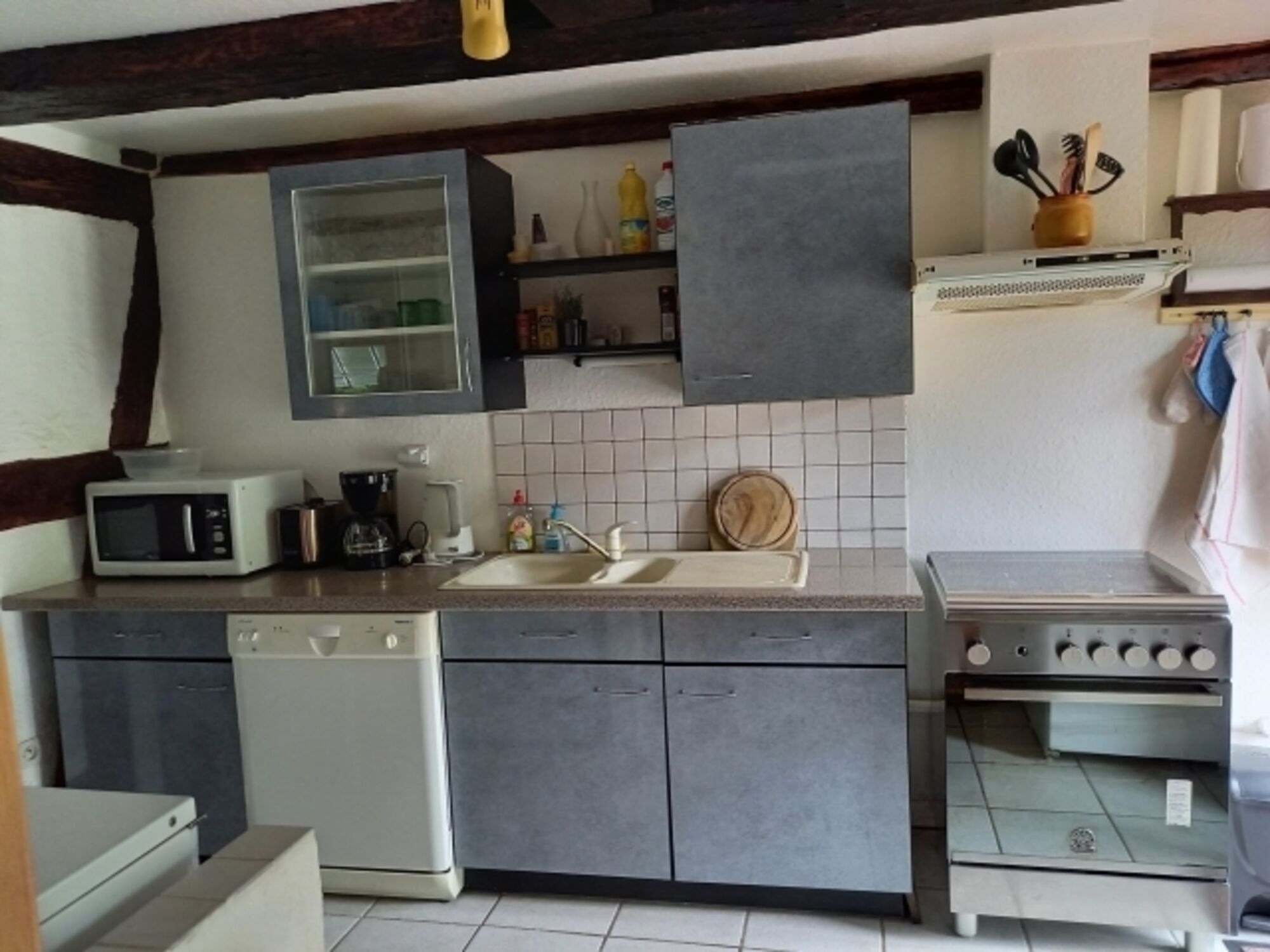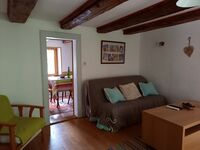 Einrichtung: Das Haus wurde im Jahr 2000 und 2012 renoviert. Die alten Holzbalken sind teilweise noch zu sehen und geben dem Haus eine wohnliche Atmosphäre. Da es ein altes Bauernhaus ist, ist die Deckenhöhe geringer. Feriengerechte, nette Einrichtung. Eingangsbereich mit Garderobe. Wohnraum mit Schlafcouch für 2 Personen, Sessel, Fernseher. Esszimmer. Komplett eingerichtete Küche mit Holzofen (auch zum Heizen) 4-Flammen-Gasherd, Spülmaschine, Abzugshaube, Kühlschrank mit Gefrierteil, Kaffeemaschine, Toaster. Essplatz mit Tisch und Stühlen. Ausgang in den eingezäunten Garten. Bad mit Wanne und Dusche, Waschmaschine, Toilette.