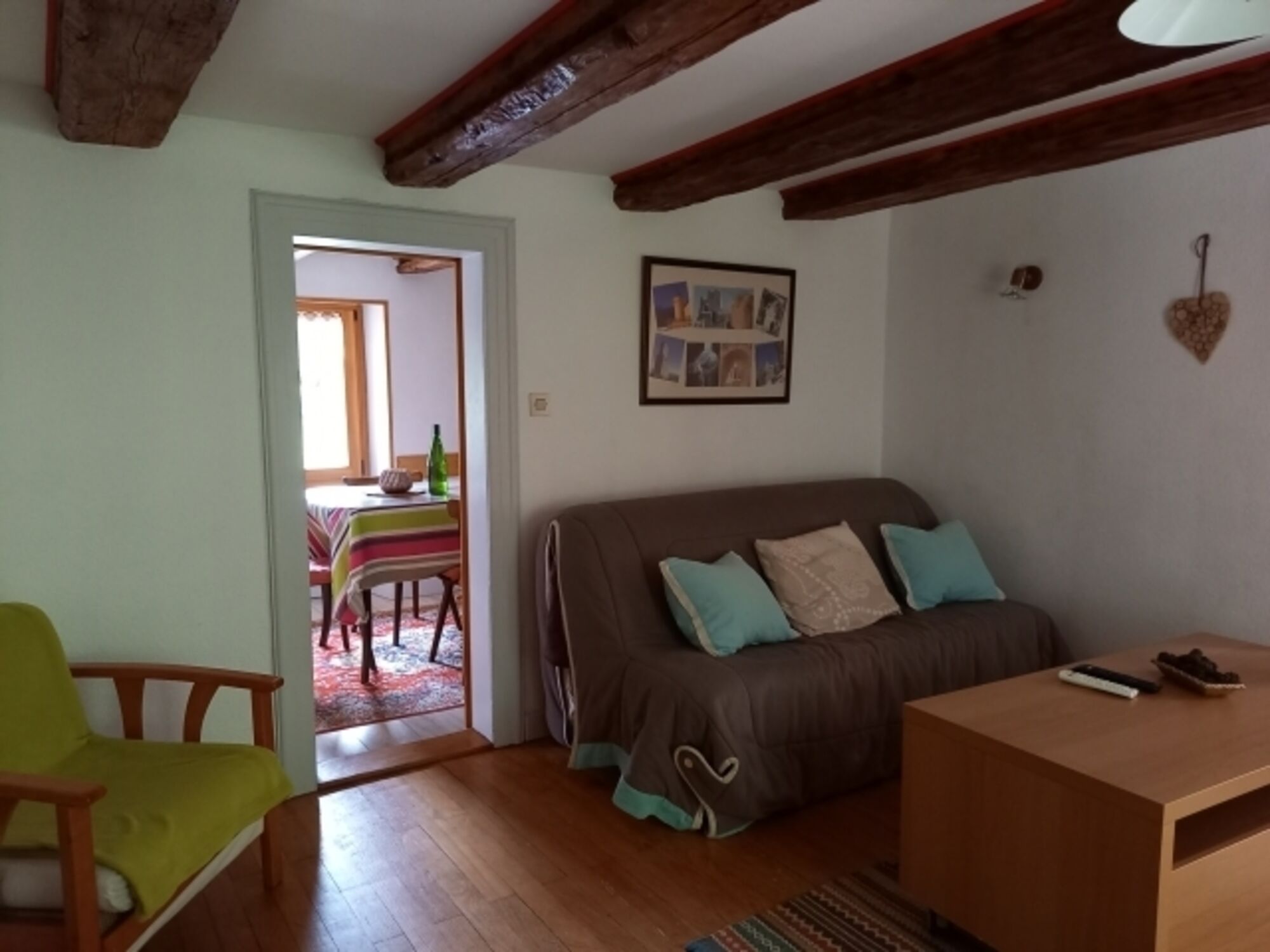 OG: Das OG ist über eine etwas steile Treppe erreichbar. (geringe Dachschräge) Schlafzimmer mit franz. Bett und Einzelbett und hübschem Zierofen. Die Holzbalken sind hier schön zu sehen. Schlafzimmer mit Doppelbett. Sep. Toilette. E-Heizung und Holzofen in der Küche. Stellplatz vor dem Haus.