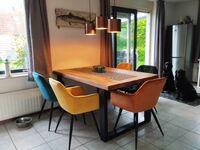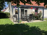 Weitere Austattungsmerkmale: Waschmaschine, Trockner, Spülmaschine, Gasherd, Mikrowelle, Backofen, großer Kühlschrank, Gefrierschrank, Küchenwaage, Mixer, Waffeleisen, Kaffeemaschine, Toaster. Der 350 qm große Garten ist rundum 140 cm hoch eingezäunt. Auf der überdachten Terrasse mit voller Südlage befinden sich die Gartenmöbel mit großem Sonnenschirm und Holzkohlegrill.