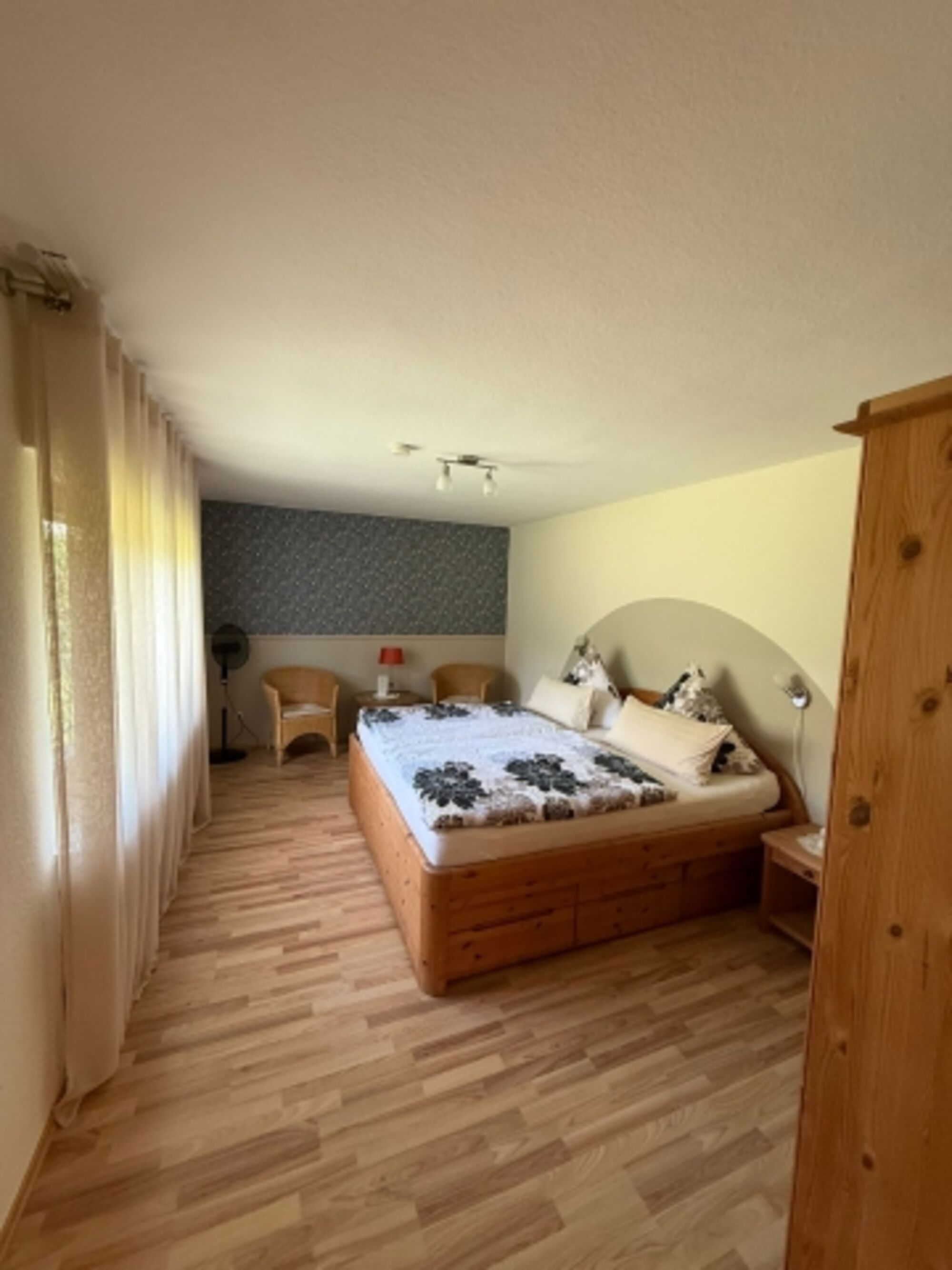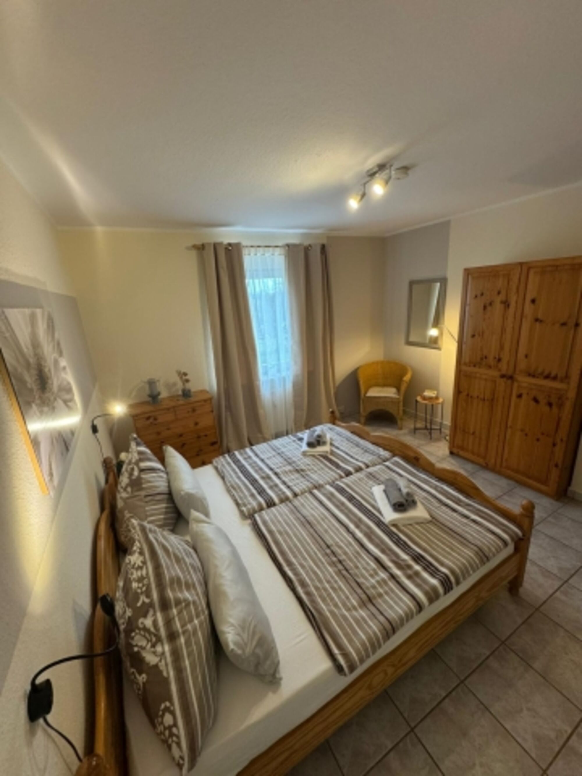Doppelbett 1,80 x 2,00m, Kommode, Spiegel, Leselampe am Bett