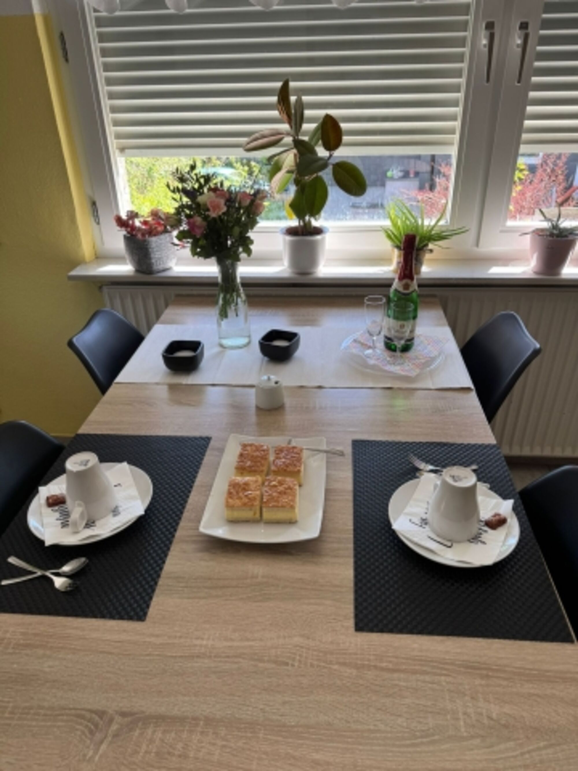 Induktionsherd, Dunstabzugshaube, Kühlschrank mit Gefrierfach, Gefrierschrank, Senseo-Kaffeeautomat, Eierkocher, Mixer, Korkenzieher / Flaschenöffner, Gewürze (Salz, Pfeffer, Zucker), Geschirrhandtücher, Mülltüten, Essplatz in der Küche