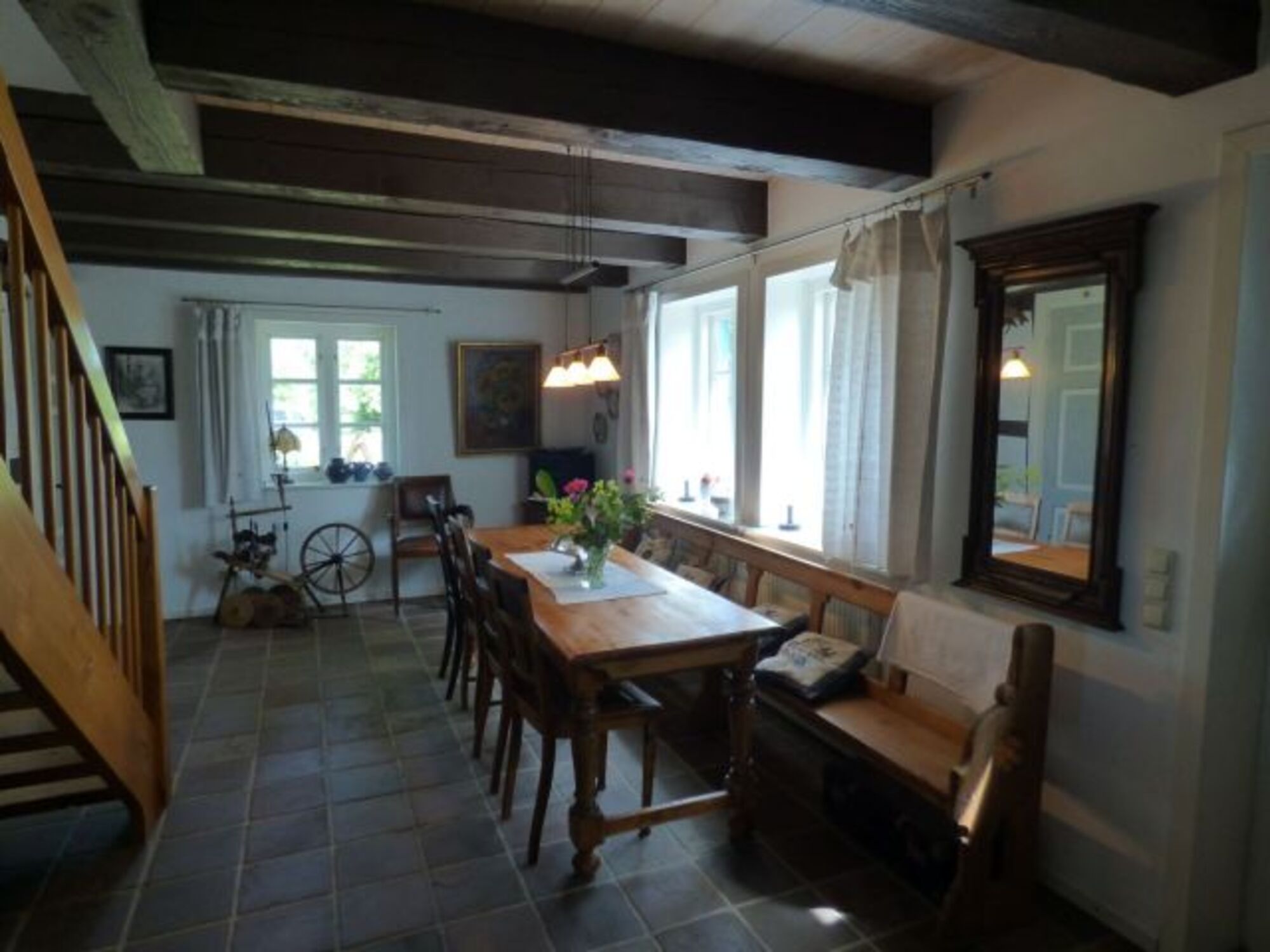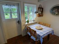 Das Landhaus bietet im Erdgeschoss eine kuschlige Kaminecke im Wohnzimmer, eine vollausgestattete Küche mit Essplatz für 4 Personen, die Diele mit einem großen Gesindetisch, einen Hauswirtschaftsraum mit Waschmaschine und eine Gästetoilette.