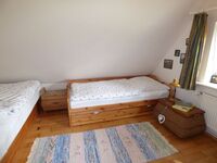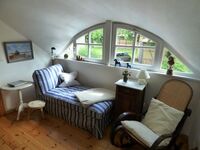 Im Obergeschoss befindet sich ein Elternschlafzimmer sowie ein weiteres Schlafzimmer mit 3 Betten und TV, das Duschbad mit WT und WC in Fledermausgaube, eine gemütliche Leseecke in der Fledermausgaube Südseite.