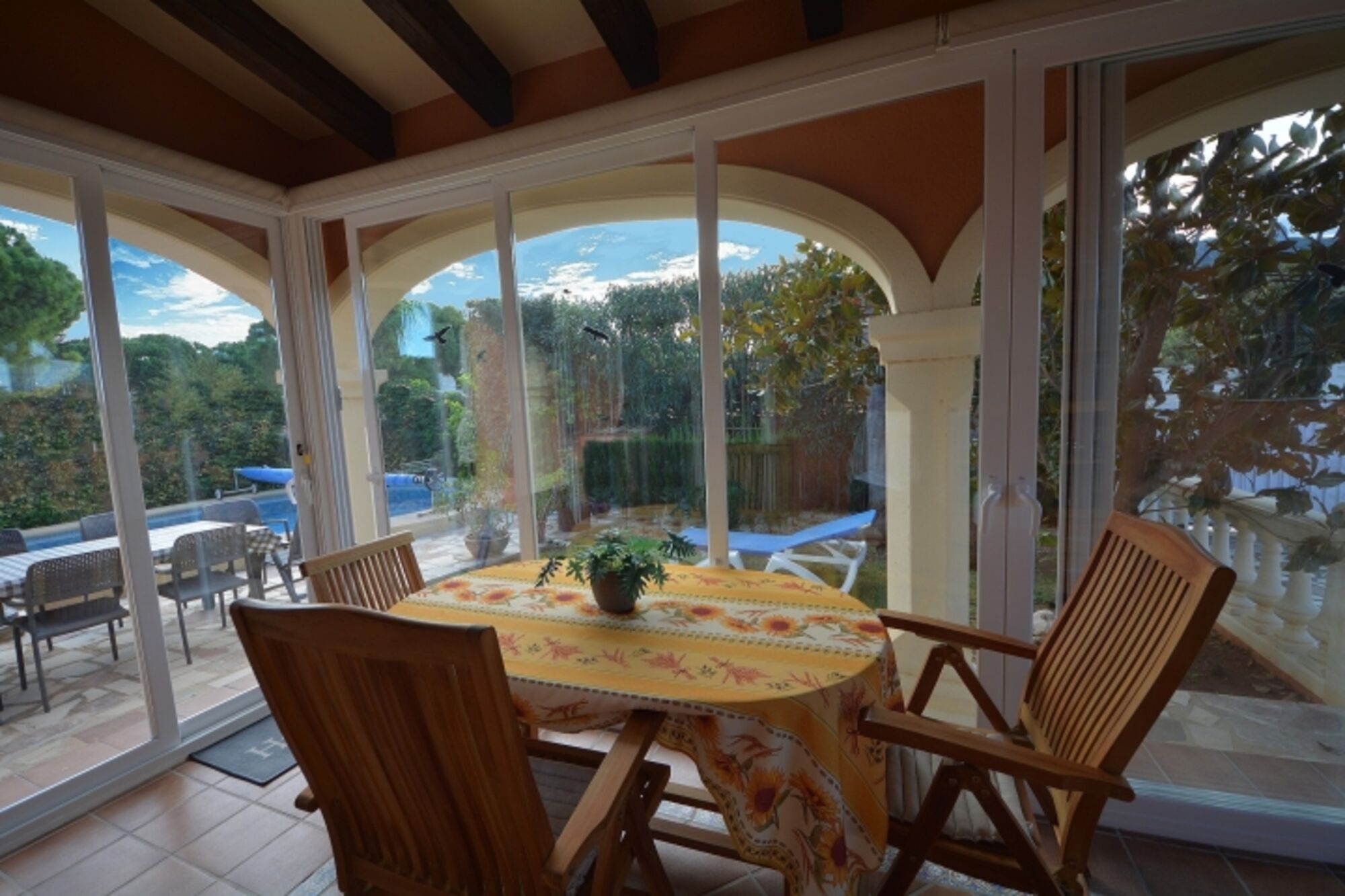 Das Haus ist ca. 140 qm groß, hat 3 Schlafzimmer für max. 5 Personen, davon ein Turmzimmer mit eigenem Eingang, 2 Bäder, großes Wohn-Esszimmer mit offenem Kamin, lichtdurchfluteten Wintergarten, Küche, Gaszentralheizung als Fußbodenheizung, Klimaanlage in allen Räumen, 2 Autostellplätze direkt auf dem Grundstück. Beste Ausstattung und Einrichtung.