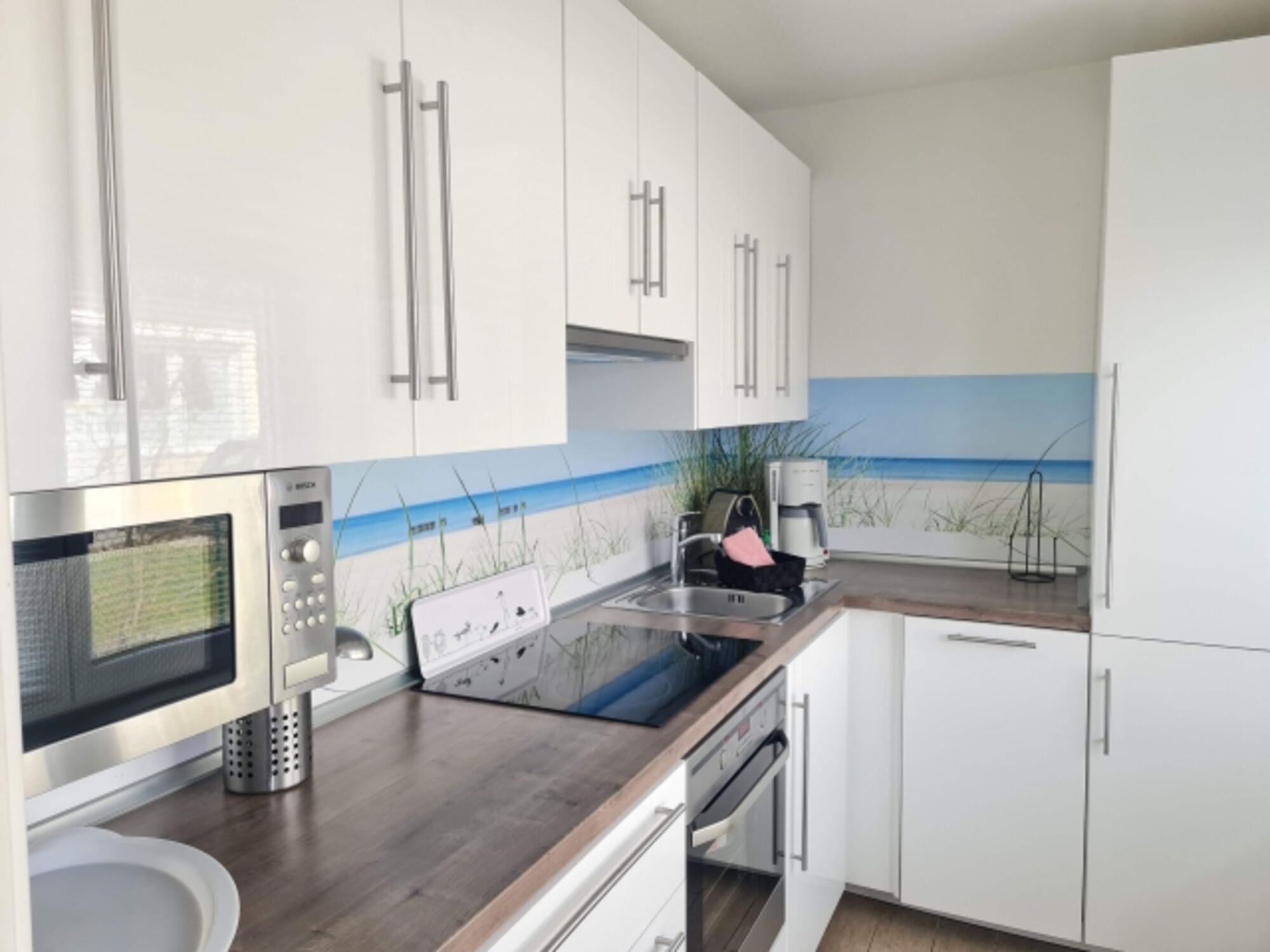 Der Wohnraum und der angegliederte Essbereich sind großzügig gehalten. Die Küche liegt direkt neben dem Eingangsbereich und ist mit Backofen, Ceranfeld, Geschirrspüler und Kühl-Gefrier-Kombination ausgestattet. Genügend Koch- und Essgeschirr sind selbstverständlich genauso vorhanden wie Mikrowelle, Kaffeemaschine, Toaster, Wasserkocher und eine Nespressomaschine.