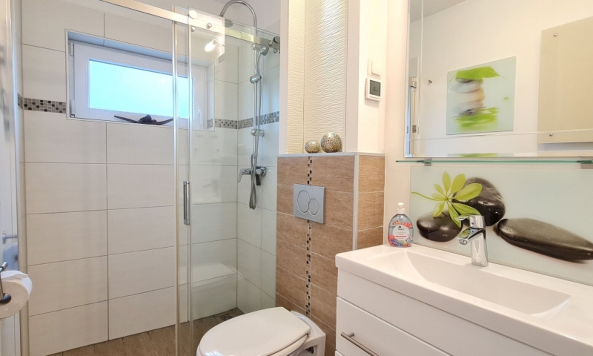 Waschbecken, Regendusche, Spiegel, Fenster im Bad