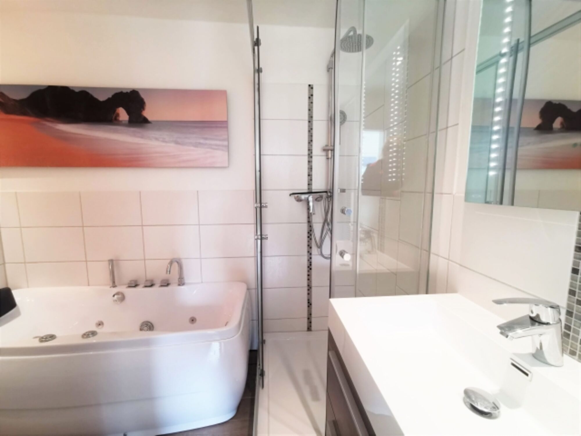 Beim großen Bad mit Whirlpool, WC, Waschbecken und weiterer Dusche befindet sich auch der Zugang zum Hauswirtschaftsraum mit Waschmaschine und Trockner.