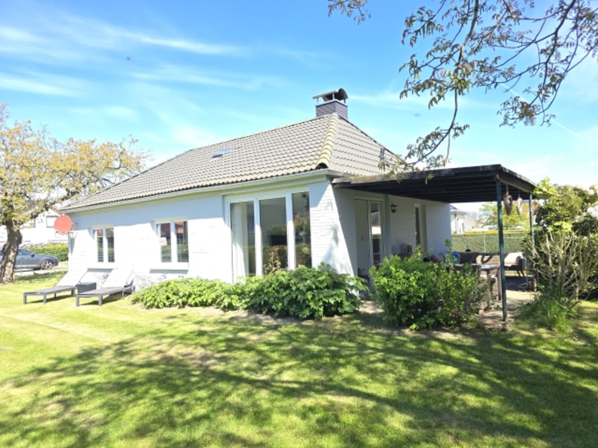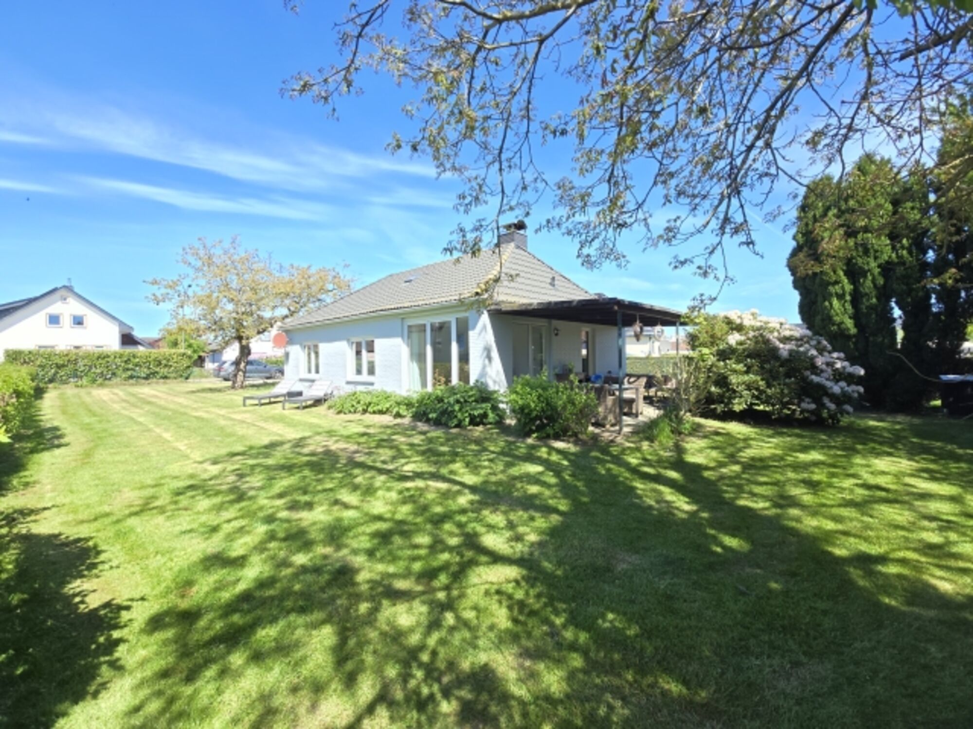 Das ca. 900 m² große Grundstück ist komplett eingezäunt. Gartenmöbel und Liegen sind selbstverständlich genauso vorhanden wie ein Grill.