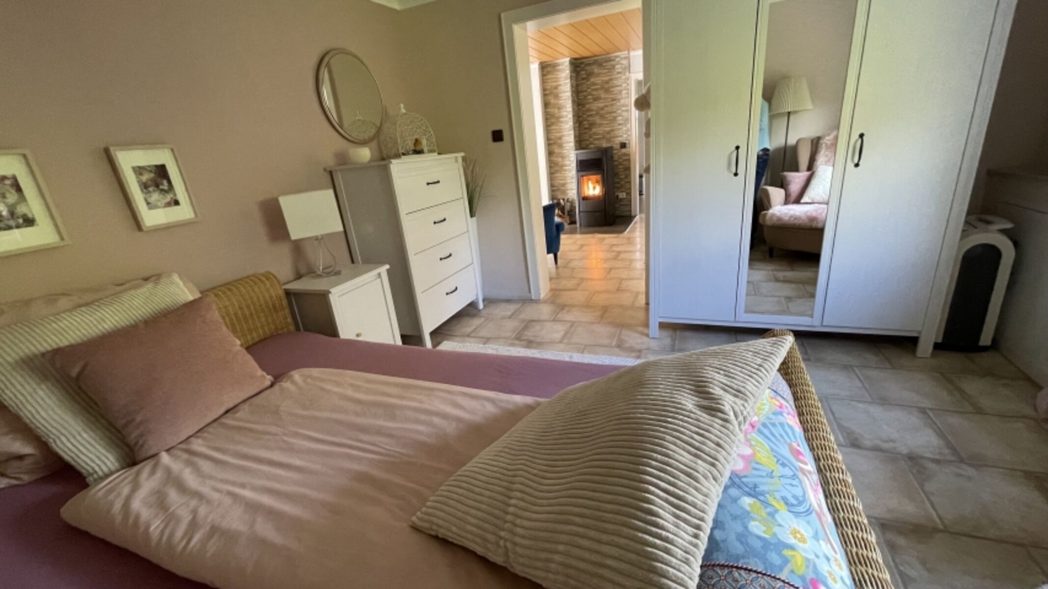 Doppelbett 1,40 x 2,00m, Einzelbett, Kommode, Spiegel, Leselampe am Bett, Fliegengitter