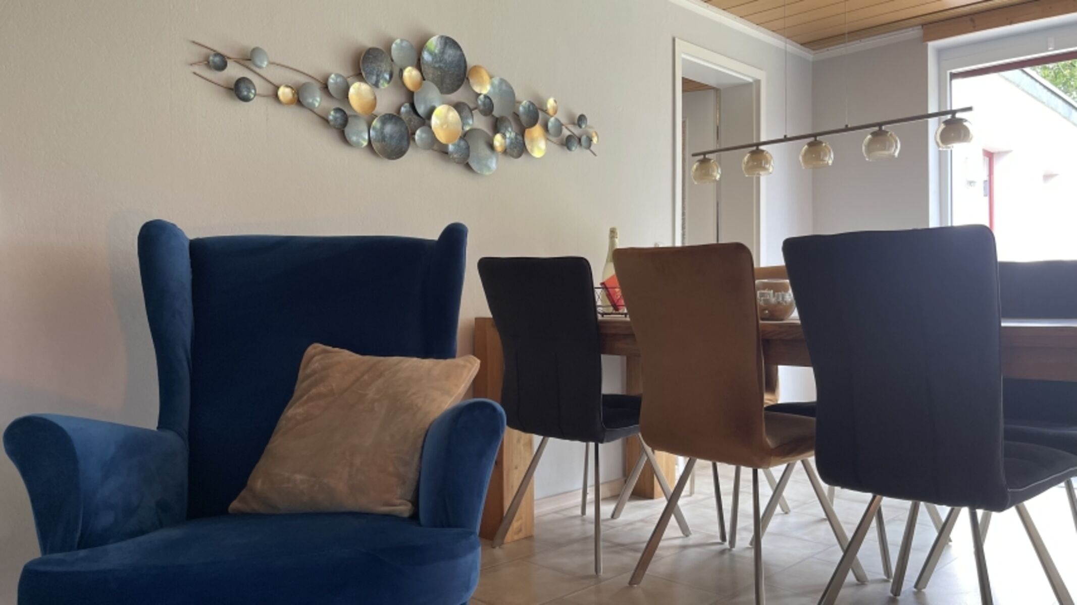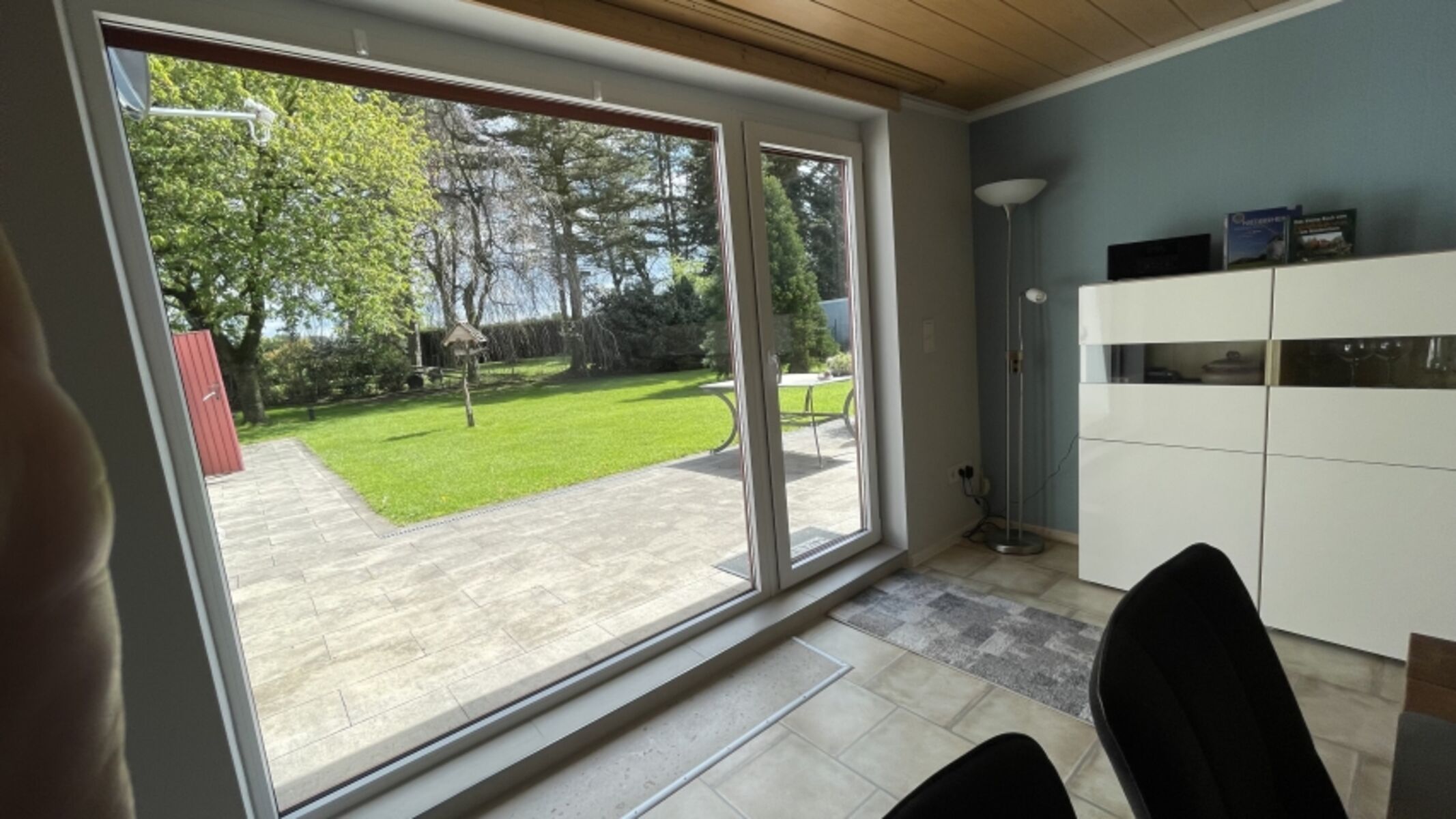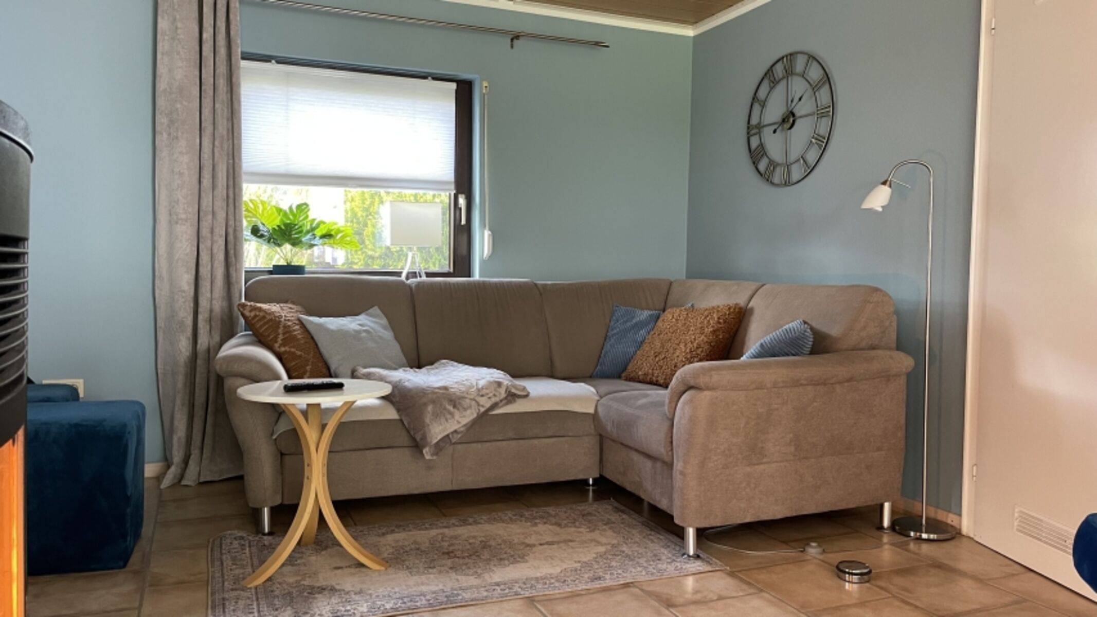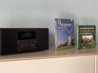 TV, TV-Sat, TV-Flachbildschirm, Blu-Ray-Player, Hi-Fi-Anlage mit Bluetooth, Bücher, Kaminofen, Eckcouch, Sessel, Fliegengitter