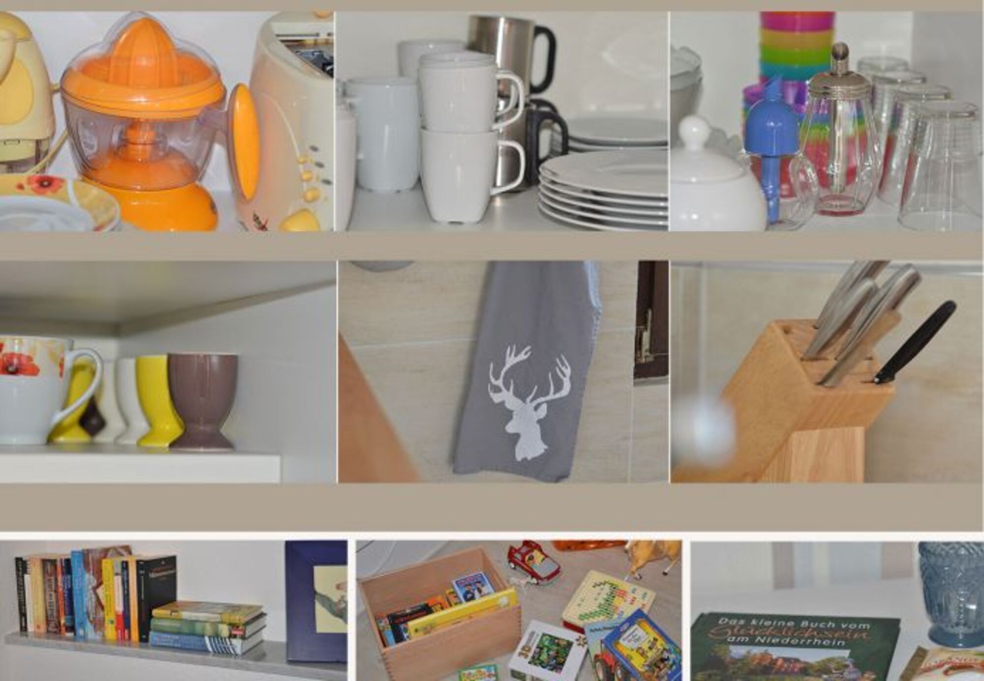 4-Platten Herd, Cerankochfeld, Dunstabzugshaube, Kühlschrank mit Gefrierfach, Gefrierschrank, Senseo-Kaffeeautomat, Eierkocher, Mixer, Elekt. Fruchtpresse, Waffeleisen, Korkenzieher / Flaschenöffner, Geschirrhandtücher, Mülltüten