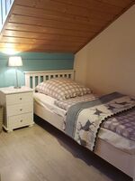 Im ersten Schlafzimmer finden Sie ein Doppelbett (1,80x2,00m) mit zwei Nachttischen und Nachttischlampen sowie einen zweitürigen Kleiderschrank mit Ablagefächern, einen Stuhl und eine Garderobenleiste. Auch in diesem Zimmer ist ein blickdichter, wärme- und schallisolierender Vorhang vorhanden. Zudem finden Sie hier einen Verdunklungsrollo, so dass nichts Ihren Schlaf stören wird. Zu dem Schlafzimmer gehört eine separate Toilette mit einem kleinen Waschbecken, so dass Sie bei Bedarf nicht ins Erdgeschoss zu gehen brauchen und nachts auch niemanden stören.
