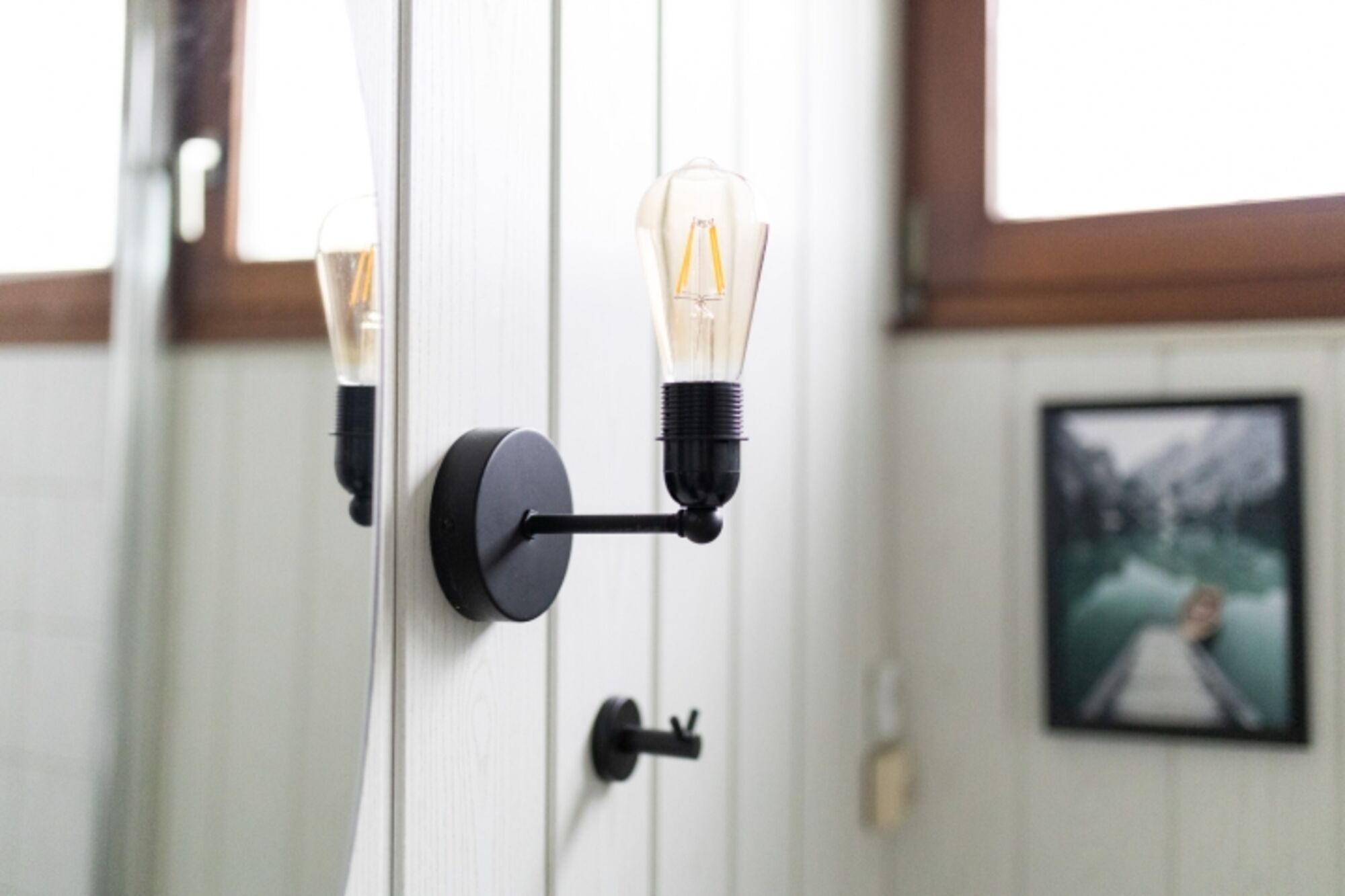Waschbecken, Spiegel, Fenster im Bad