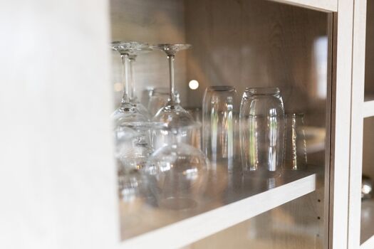 4-Platten Herd, Cerankochfeld, Dunstabzugshaube, Kühlschrank mit Gefrierfach, Gefrierschrank, Senseo-Kaffeeautomat, Waffeleisen, Korkenzieher / Flaschenöffner, Gewürze (Salz, Pfeffer, Zucker), Öl / Essig, Geschirrhandtücher, Mülltüten