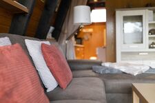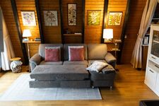 Hier befindet sich ein komfortables Schlaf-Ecksofa, HDTV-TV (Smart TV) eine gemütliche Essecke mit Eckbank, eine voll ausgestattete Küche (Herd, Backofen, Spülmaschine, Kaffeemaschine, Senseo Maschine, Toaster, Wasserkocher, Mikrowelle, Kühlschrank mit Tiefkühlfach), ein kleiner Hauswirtschaftsraum mit Garderobe und ein Tageslichtduschbad.