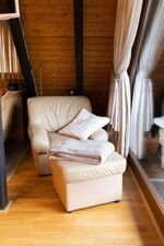 Vom Wohnzimmer gelangt man über eine der Dachneigung angepasste Raumspartreppe ins Obergeschoss. Dort befinden sich zwei getrennte Schlafzimmer. Im größeren steht ein Doppelbett mit 2,00 m x 2,00 m Größe, im kleinen Schlafzimmer zwei getrennte Betten mit je 0,90 m x 2,00 m Größe.