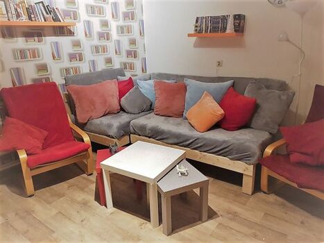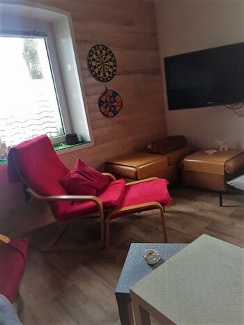 - Wohnzimmer (Fernseher, Dvd, Dartspiele für Erwachsene und Kinder,Kicker, Gesellschaftsspiele, Bücher in mehreren Sprachen, VLAN (gratis)..Stressless Sofa in Leder (Abdeckungen für Hunde sind vorgesehen, Pelletofen damit es richtig gemütlich wird