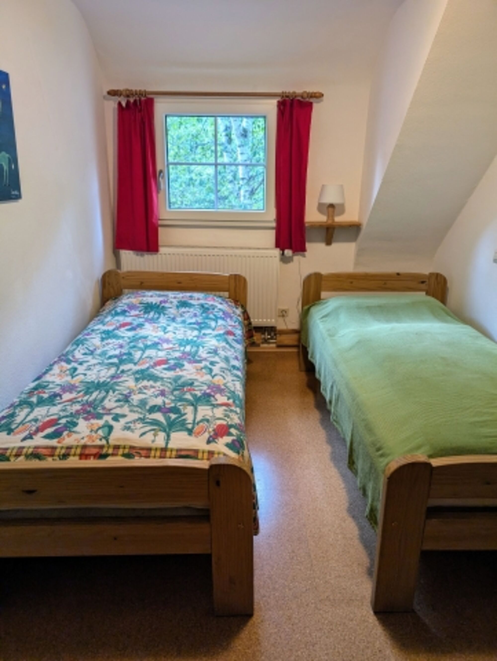 Schmale etwas steile, geschlossene Treppe ins OG. Im OG sind 4 Schlafzimmer. Eines mit Doppelbett und Kinderbett. 2 mit 2 Einzelbetten. Ein Durchgangszimmer mit Doppelbett als aufklappbares Bett. (teilweise Dachschräge). Von diesem Zimmer gelangen Sie auf den Balkon mit Gartenmöbeln. Neue Zentralheizung über Pellets und Solar. Waschmaschine im sep. Schuppen.
