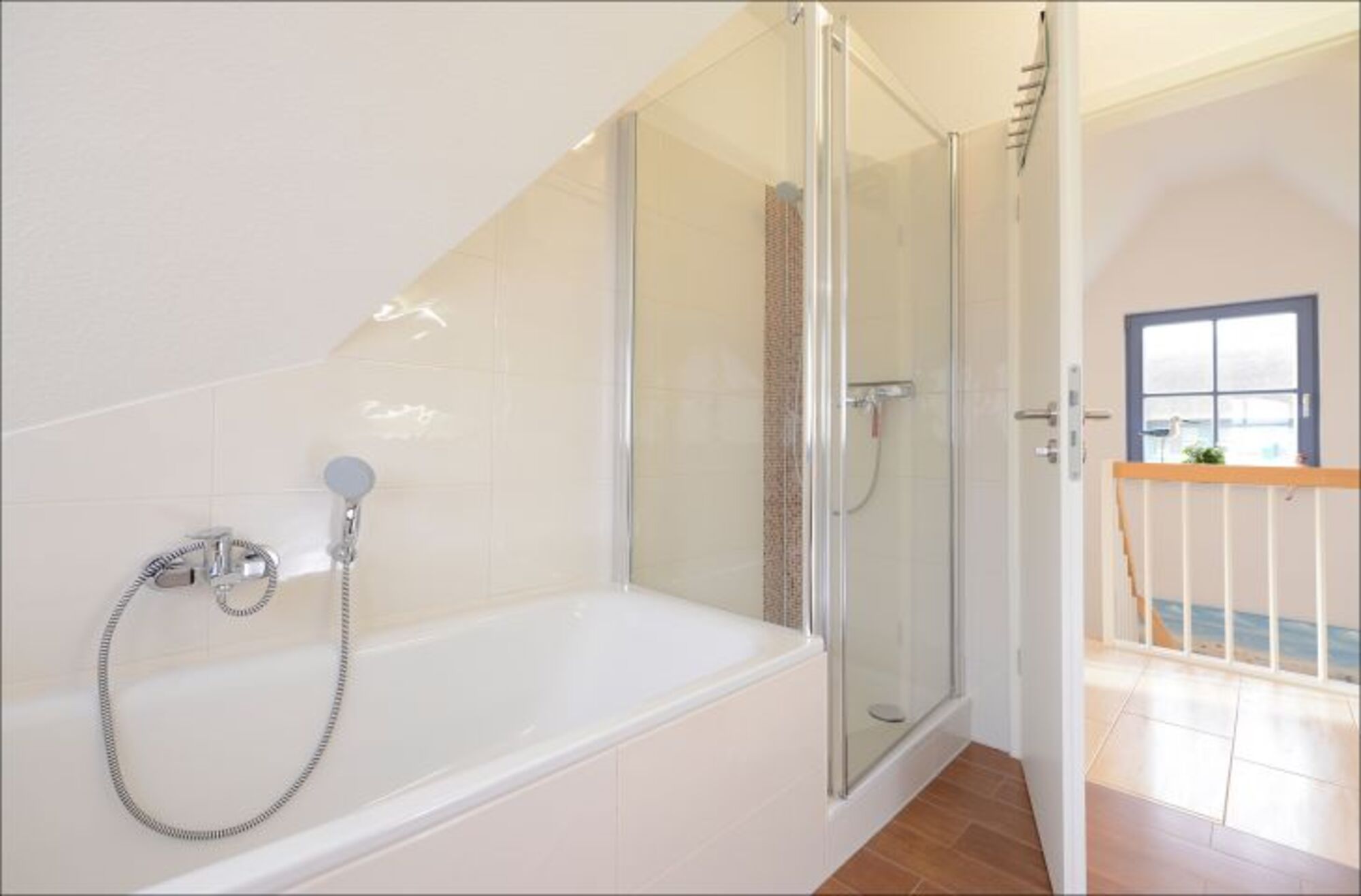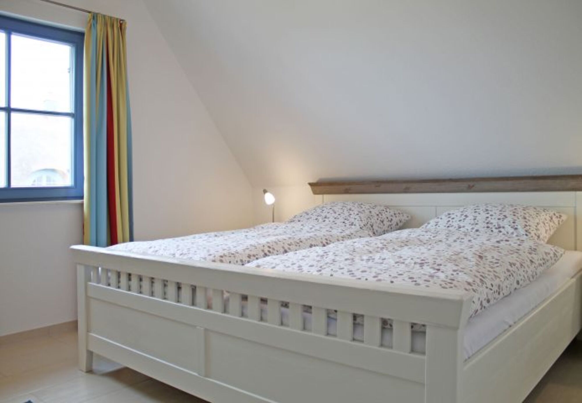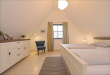 Im Obergeschoss befinden sich zwei Schlafzimmer (1 x Doppelbett, 1 x zwei Einzelbetten). Sowie das Tageslichtbad (Fön) mit Dusche und Badewanne in einer sehr hochwertigen Bauausführung.