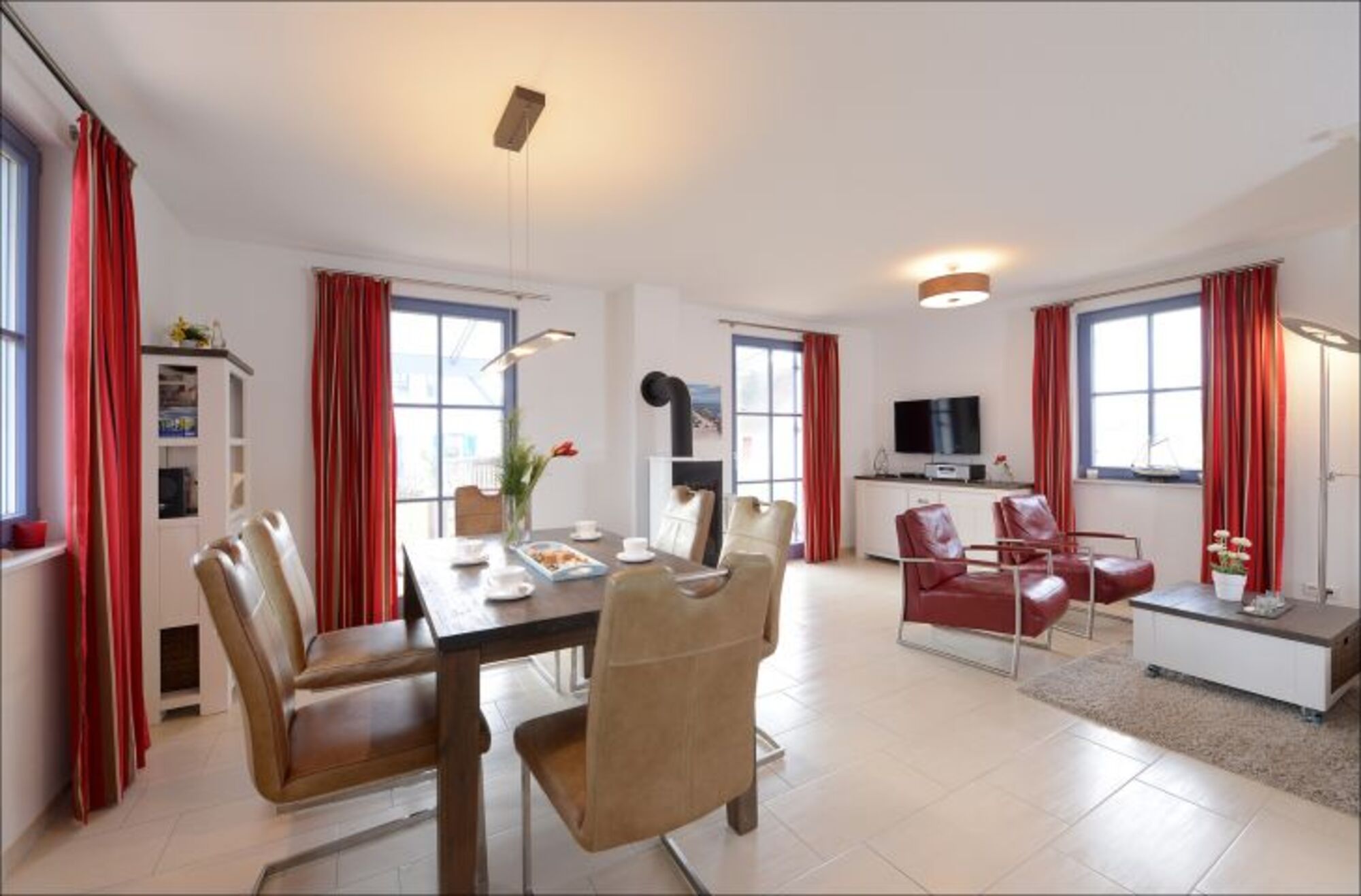 Im Erdgeschoss des Hauses empfängt Sie ein heller und offener Wohn-/ Essbereich (Schlafsofa, Stereo-Anlage mit Bluetoothfunktion, Blue-Ray-Player), inkl. Kaminofen und integrierter Küche (Geschirrspüler, Herd, Kühlschrank mit Gefrierfach, Mikrowelle, Dolce Gusto Kapselautomat, u.v.m.) sowie die Sauna mit zusätzlicher Dusche, das Gäste-WC und der Hauswirtschaftsraum mit Wasch-/ und Trockenautomat. Für Ihre Information und Unterhaltung im Ferienhaus sorgen zahlreiche Reiseführer & Karten, Bücher sowie DVDs und Spiele für drinnen und draußen!