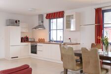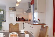4-Platten Herd, Cerankochfeld, Dunstabzugshaube, Kühlschrank mit Gefrierfach, Kaffeevollautomat, Eierkocher, Mixer, Korkenzieher / Flaschenöffner, Essplatz in der Küche
