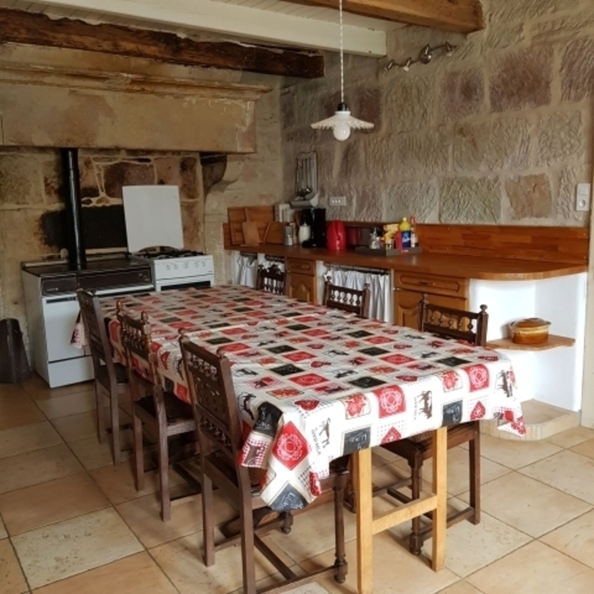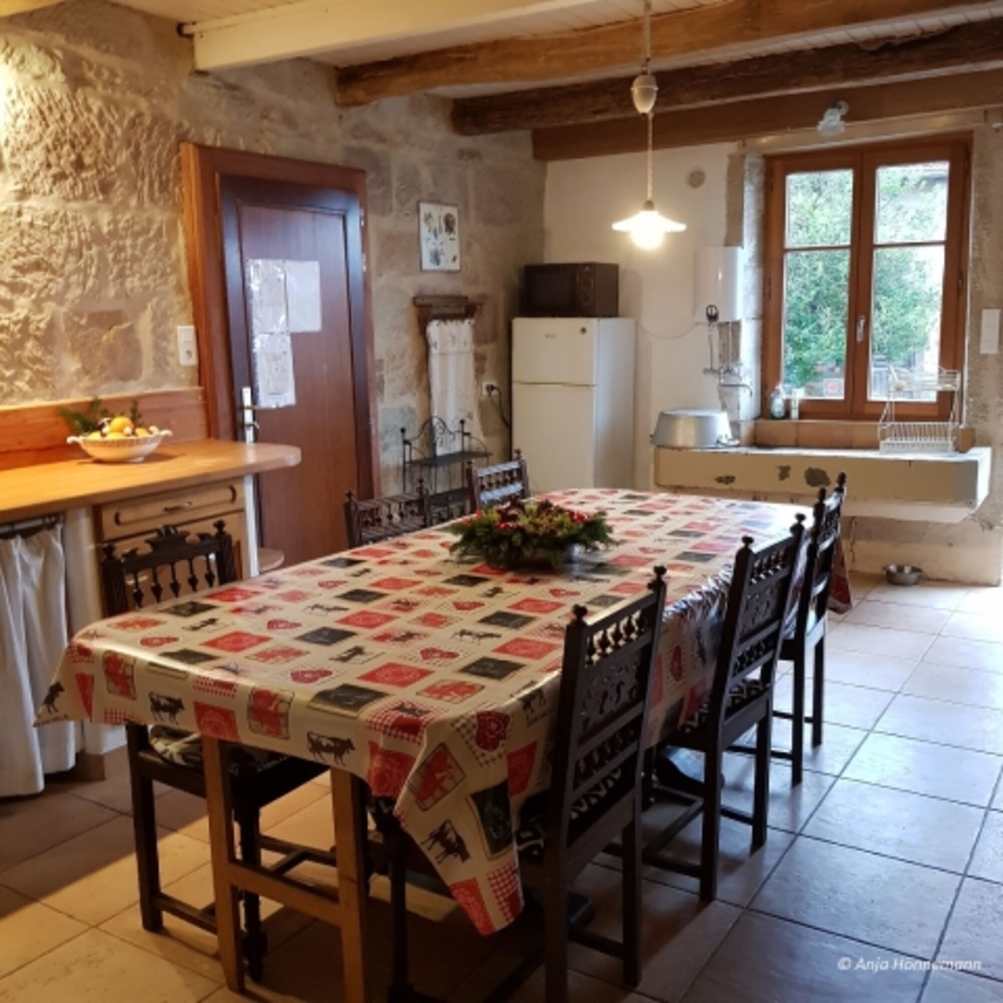 Die großzügige Küche lädt zum gemeinsamen Kochen und Essen ein. Die Küche verfügt über einen Holzherd, Gasherd mit Backofen, Kühlschrank mit Gefrierfach, Spüle, Wasserkocher, Kaffeemaschine, Toaster, Fondueset, Brotbackautomat, Handrührgerät, ... . Alle notwendigen Küchenutensilien sind ausreichend vorhanden. Der große Tisch bietet Platz für max. 10 Personen.