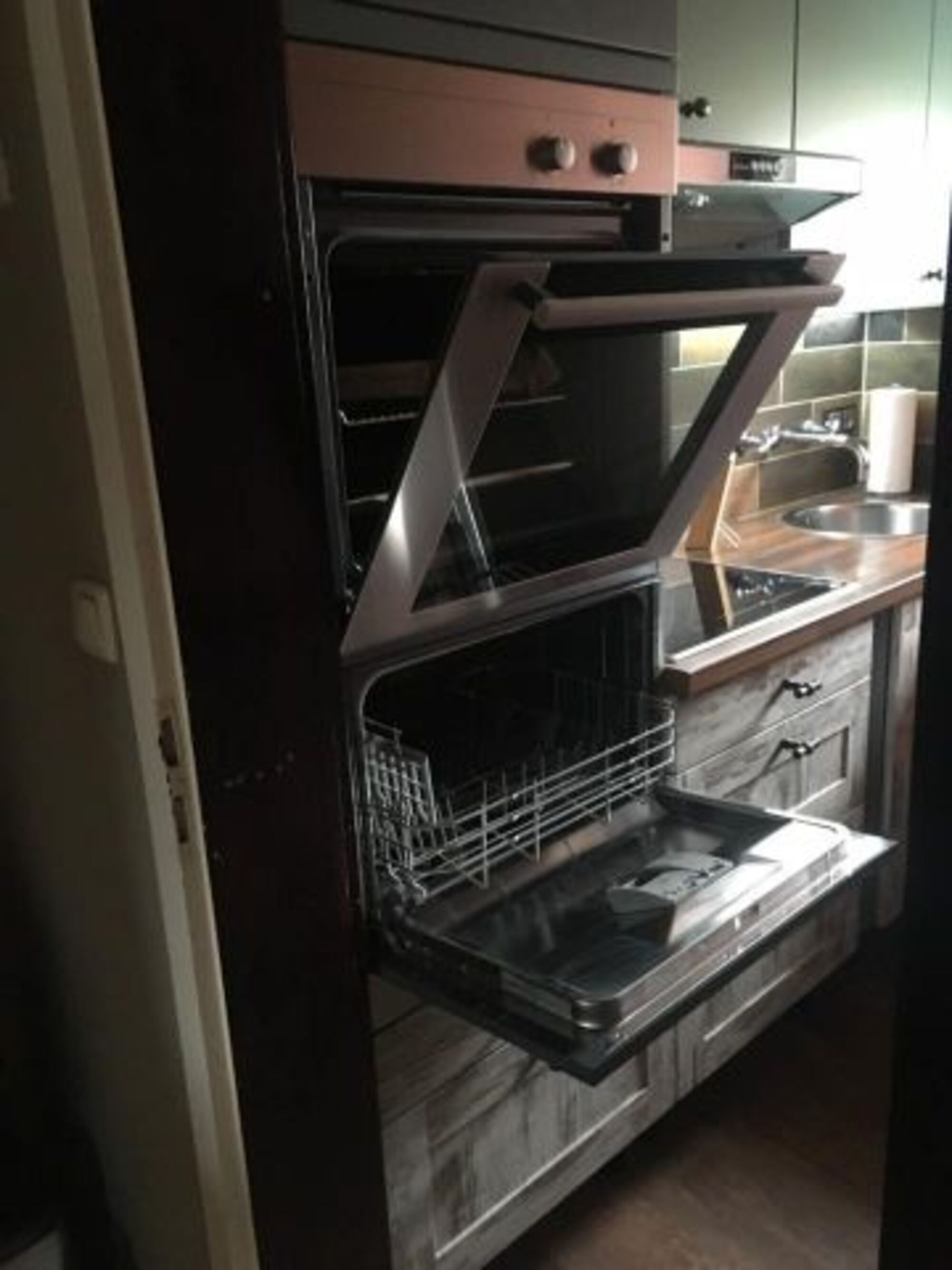 4-Platten Herd, Cerankochfeld, Dunstabzugshaube, Kühlschrank mit Gefrierfach, Korkenzieher / Flaschenöffner, Gewürze (Salz, Pfeffer, Zucker)