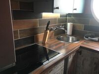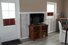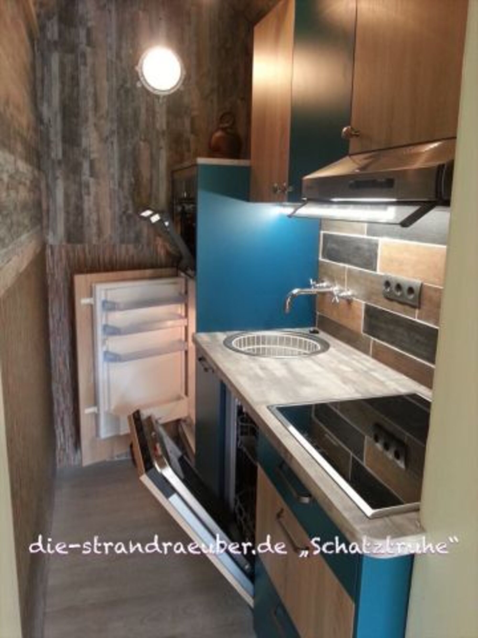 Entern Sie mit Ihrem Vierbeiner die schöne FeWo " Treibgut". Diese Räuberhöhle ist in einer einzigartigen Ausstattung mit Laminat hundefreundlich gestaltet. Im zweckmäßigen Bad mit Dusche befinden sich Fliesen. Die Küche wurde eigens für unsere Räubergäste entworfen und bietet alles, was das Herz begehrt. Cerankochfeld, Geschirrspüler und Backofen...hier fehlt es an nichts. Auf ca. 45 m² lässt es sich zu Zweit oder zu Viert gemütlich leben. Ebenerdig mit Terrasse vor der Tür. Im Wohn- Schlafraum bietet eine hochwertige Wohnlandschaft Platz zum Lümmeln oder schlafen, 2 x 2 m. Der Eßplatz befindet sich am Fenster und bei kälteren Temperaturen kann der PelletOfen angeworfen werden.