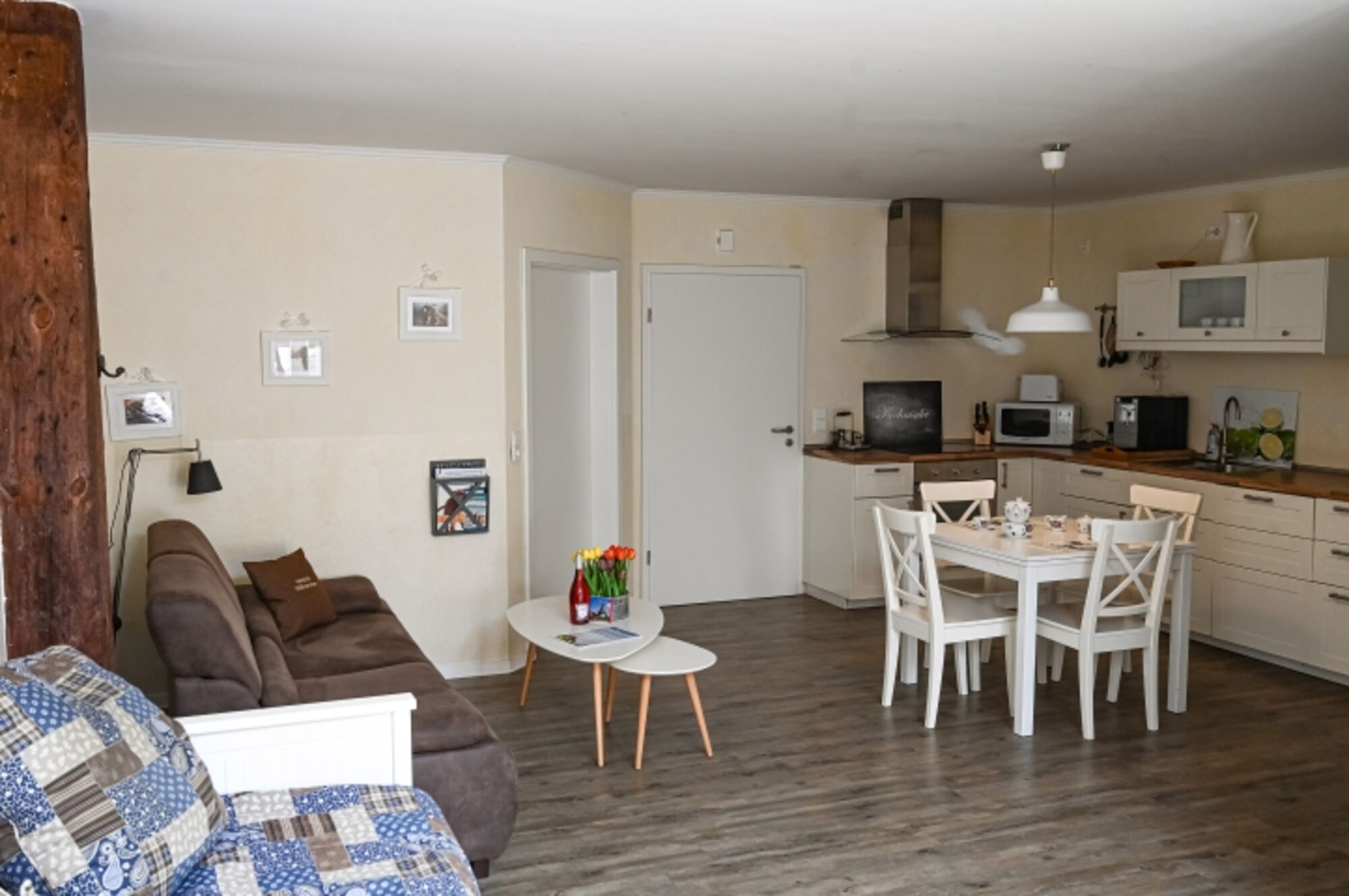 Diese ca. 63 qm große Wohnung bietet einen großzügigen Wohn- und Essbereich mit Sofa, Essplatz, TV und einem Bett, das extra für Ihre Vierbeiner ist. Die hier ebenfalls vorhandene Küche ist sehr gut ausgestattet und verfügt u.a. über Spülmaschine, Kühlschrank mit separatem Gefrierschrank, Herd, Backofen, Kaffeevollautomat, Mikrowelle, Toaster, Eierkocher und Wasserkocher.
