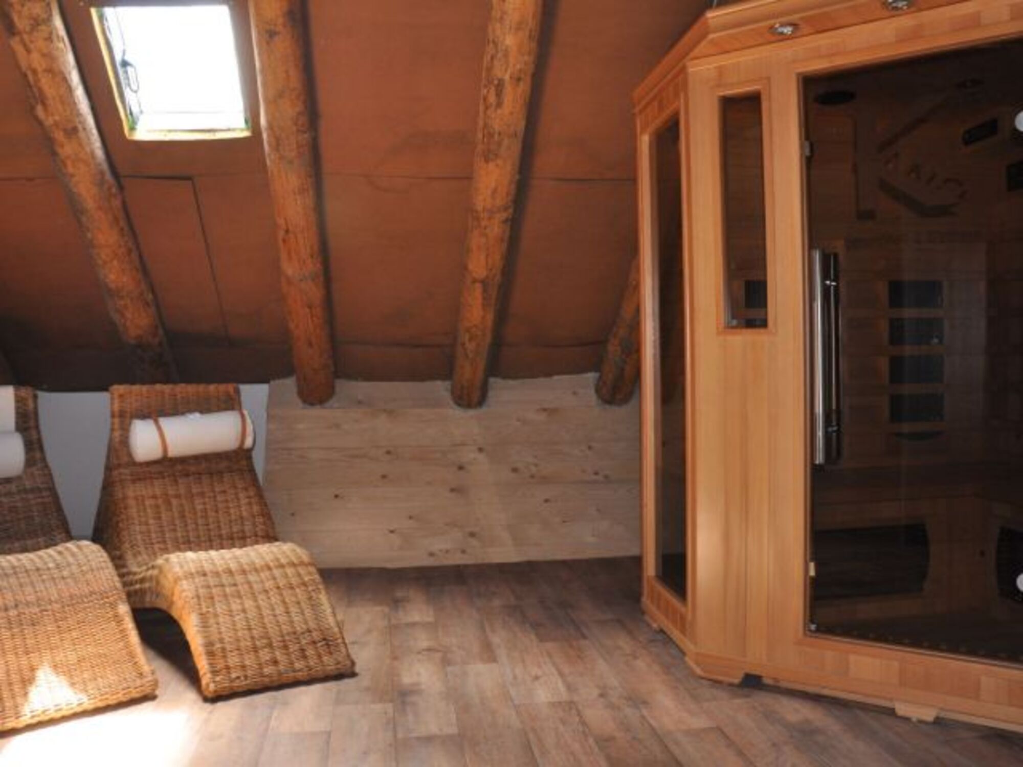 Im Gemeinschaftsbereich des Gulfhofes befindet sich ein kleiner Wellnessbereich mit Sauna, Infrarotkabine, Duschen und Ruhebereich. 20 Minuten Sauna oder Infrarotkabine kosten jeweils 5 €, zahlbar bei Anreise.