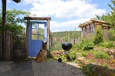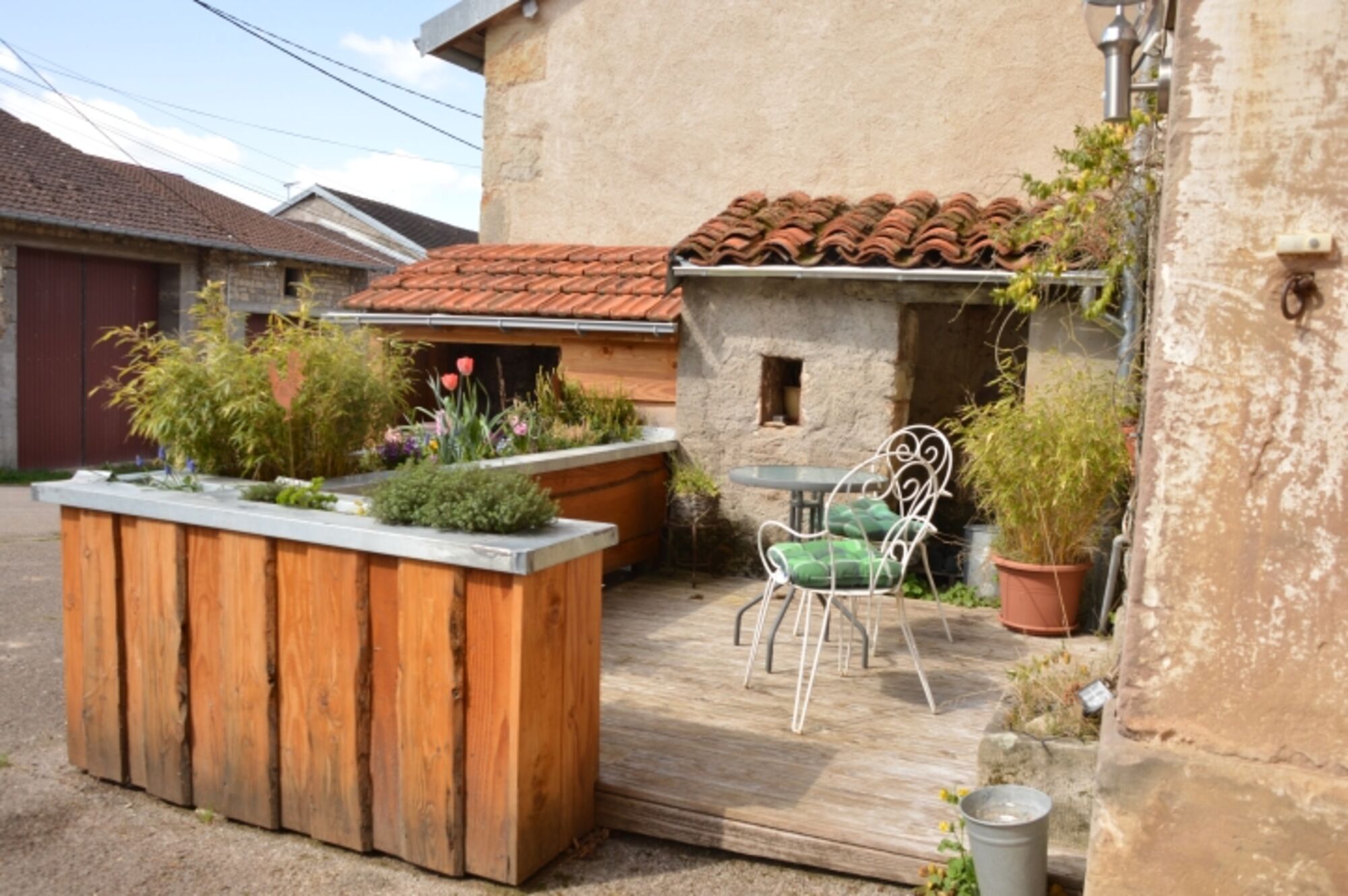 Über die Scheune gelangen Sie in den Wohnbereich und in den kleinen, eingezäunten Terrassengarten . Zwei überdachte Sitzecken befinden sich hinter dem Haus. Dort können Sie ungestört ein Buch lesen, grillen, und sich entspannen. Vor dem Haus gibt es eine weitere kleine Terrasse, die Sie einläd am Dorfleben teilzunehmen.