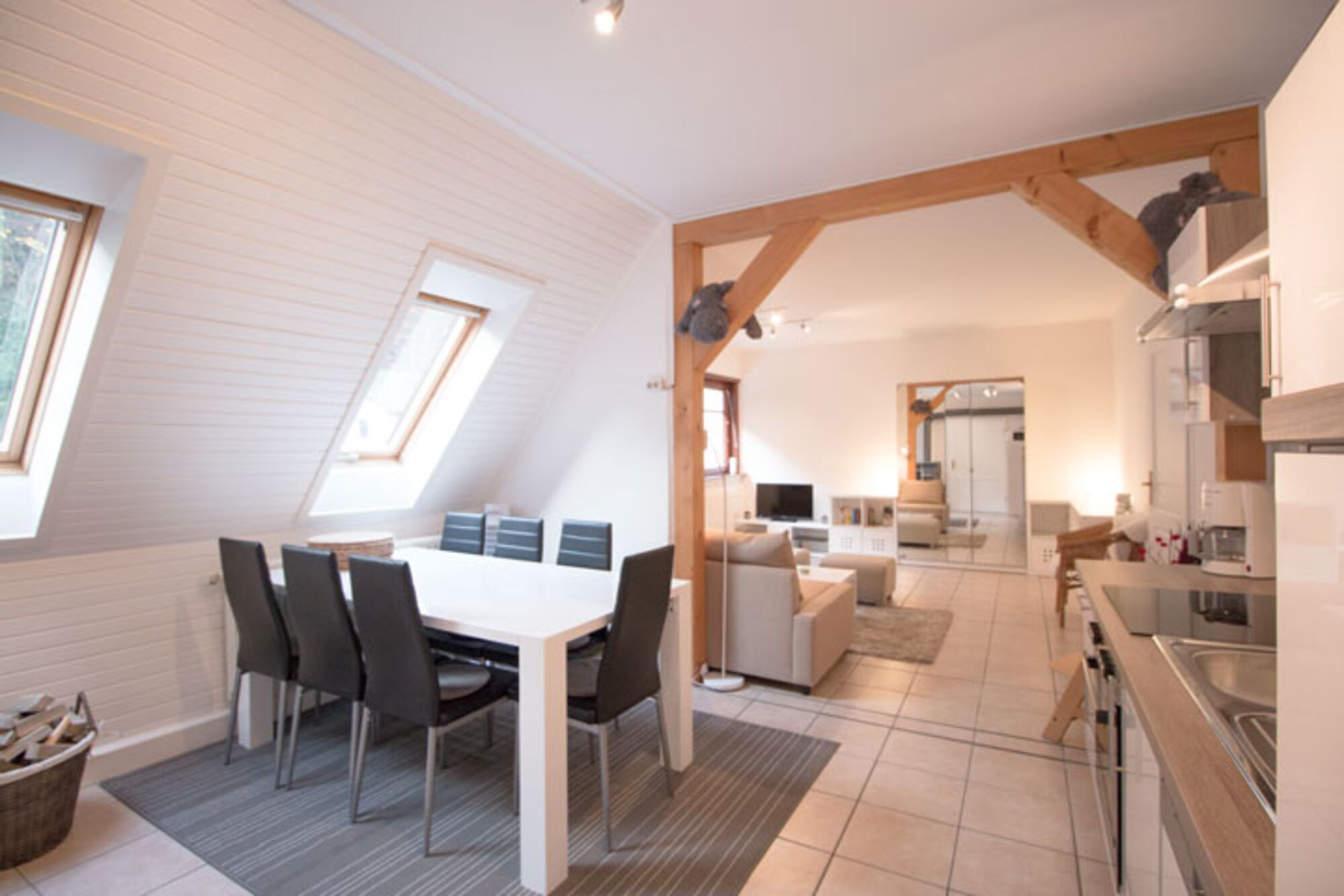 Offen gestaltete, voll ausgestattete Küche mit Essplatz und Kaminofen für gemütliche Stunden.