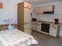 4-Platten Herd, Cerankochfeld, Dunstabzugshaube, Kühlschrank mit Gefrierfach, Geschirrhandtücher, Essplatz in der Küche