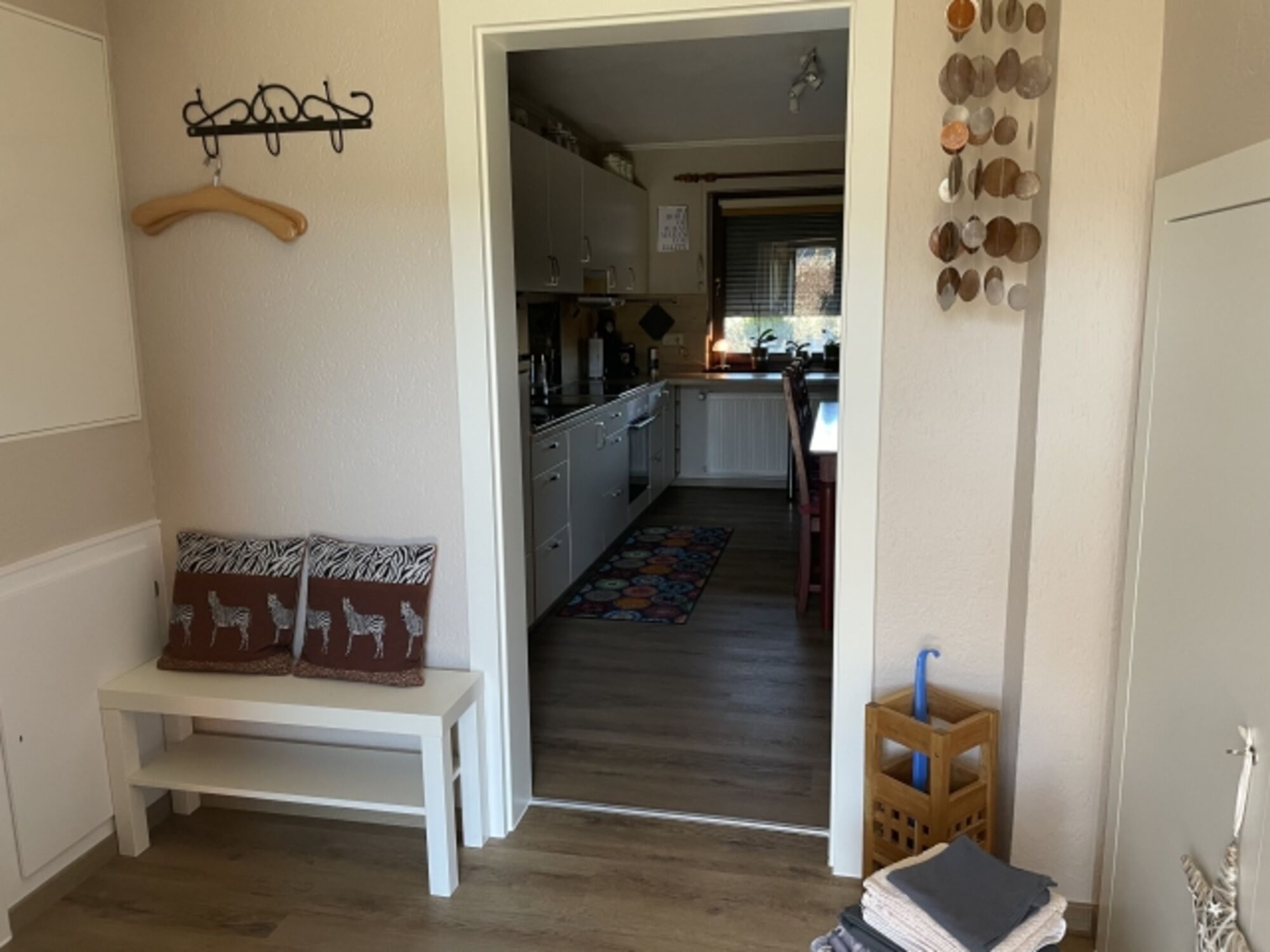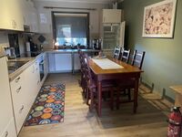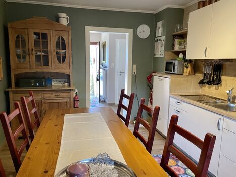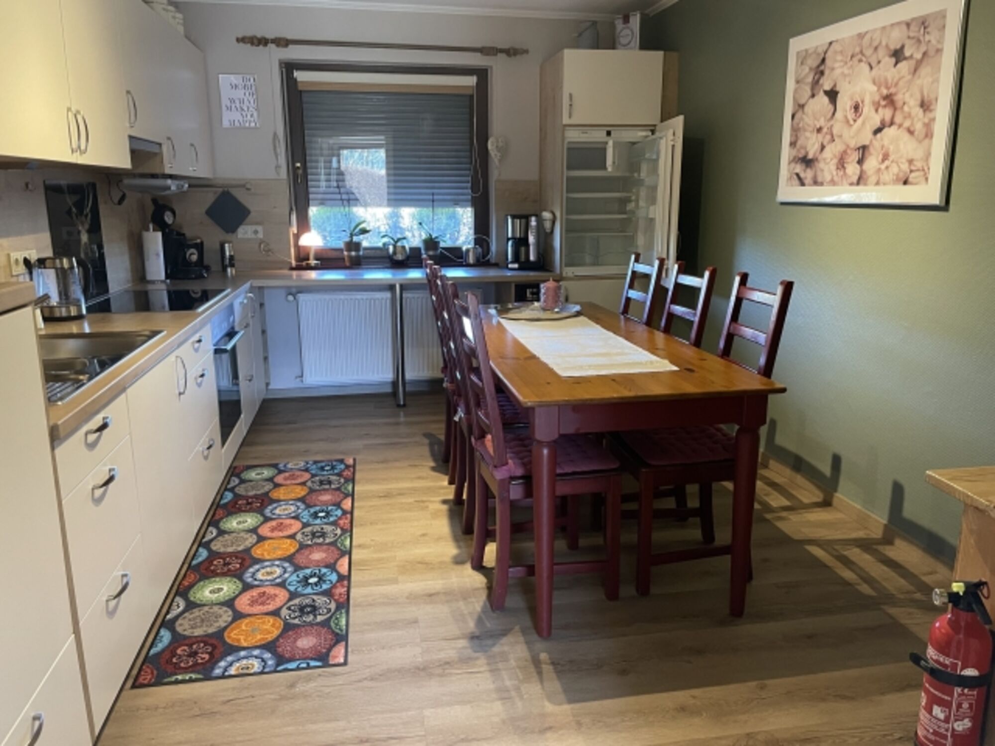 4-Platten Herd, Cerankochfeld, Dunstabzugshaube, Kühlschrank mit Gefrierfach, Senseo-Kaffeeautomat, Mixer, Korkenzieher / Flaschenöffner, Gewürze (Salz, Pfeffer, Zucker), Öl / Essig, Geschirrhandtücher, Mülltüten, Essplatz in der Küche